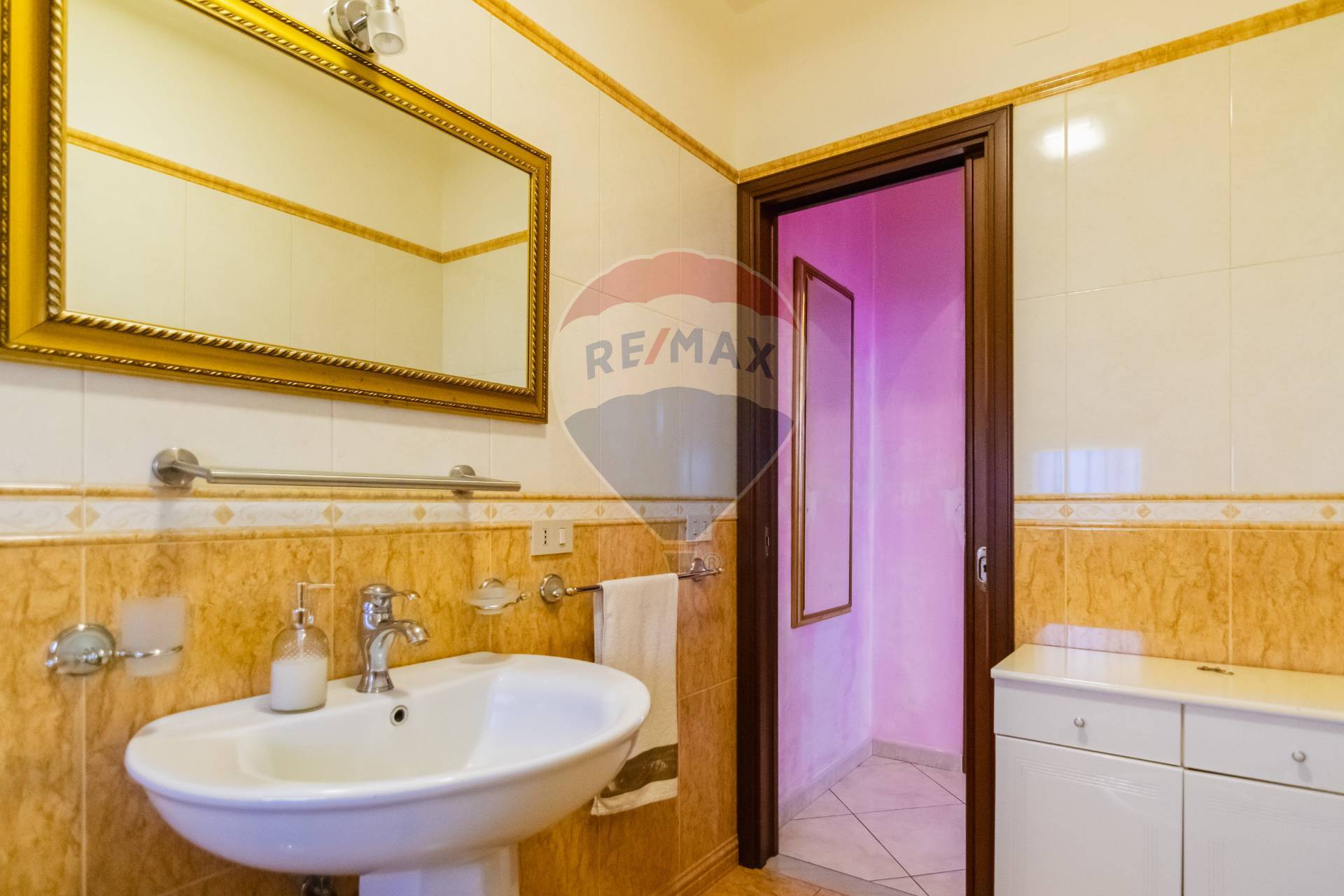 Il bagno, spazioso e signorile, è dotato di una vasca da bagno e rifinito con materiali di pregio e dettagli scelti con gusto impeccabile.