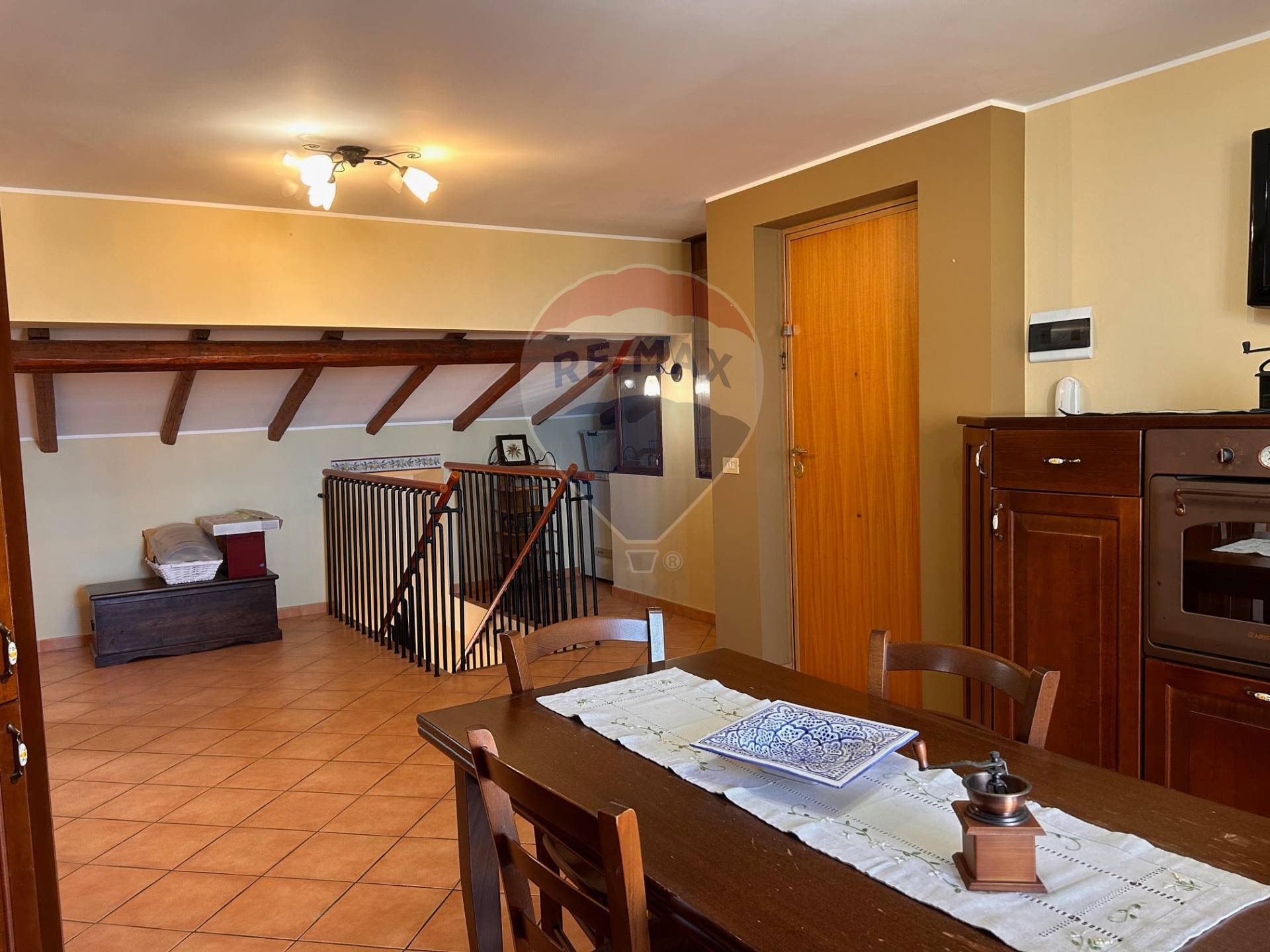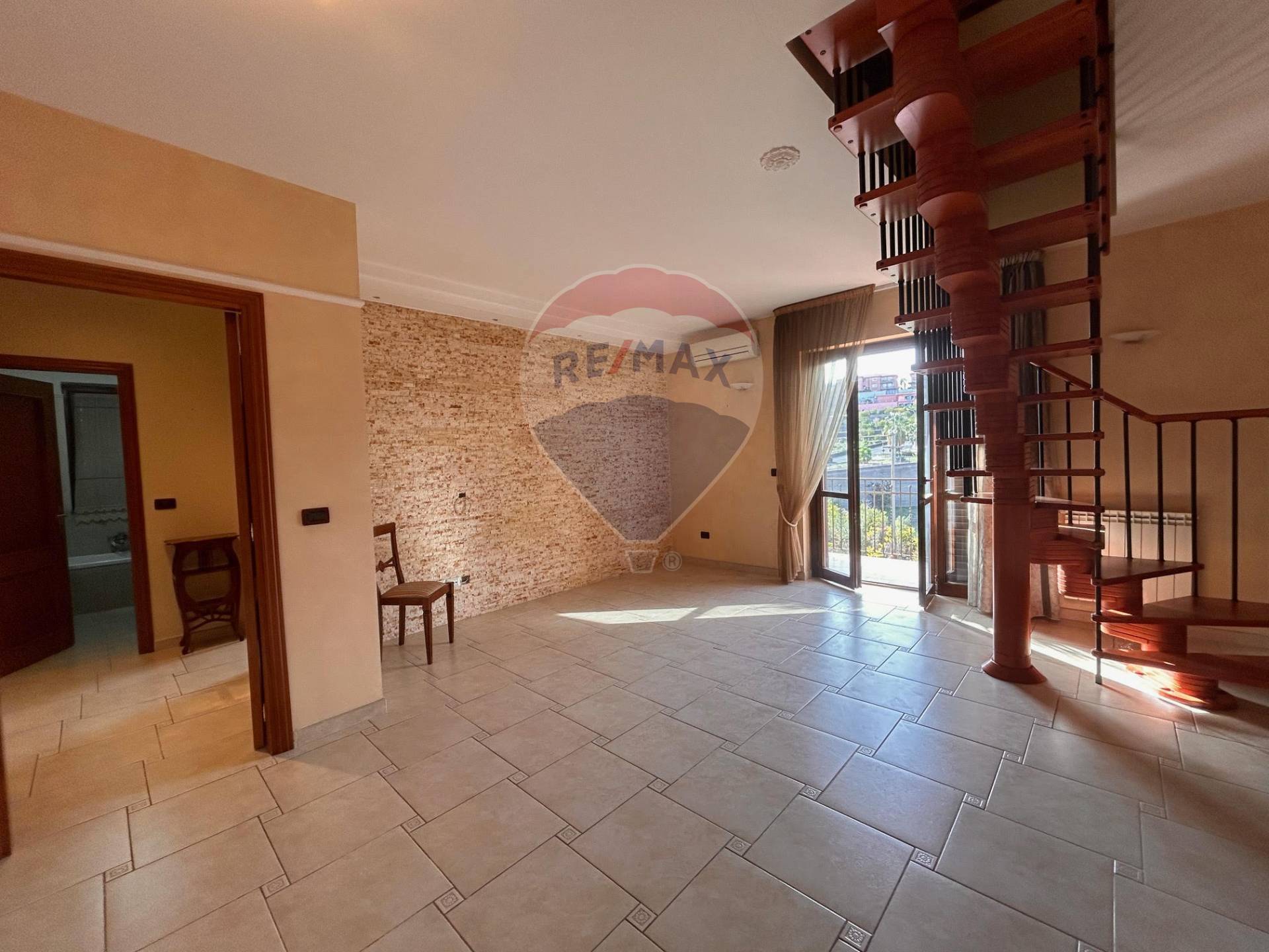 Il Piano superiore mansardato è collegato sia dalla scala interna realizzata in legno massello e sia dal vano scala, dove troviamo un’ampia cucina che si affaccia su un terrazzino dove poter cenare durante le serate estive e da cui poter ammirare il golfo di Catania.