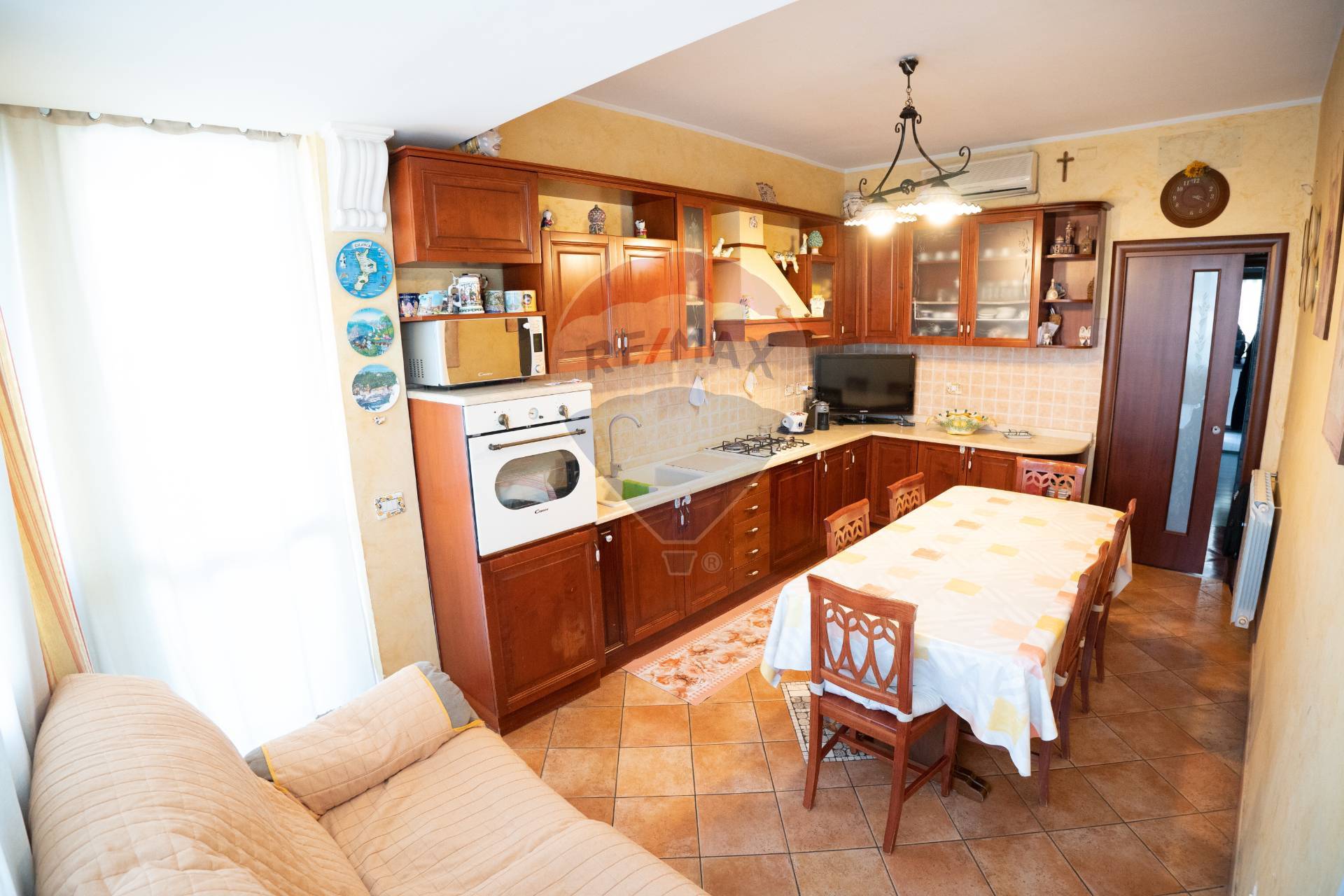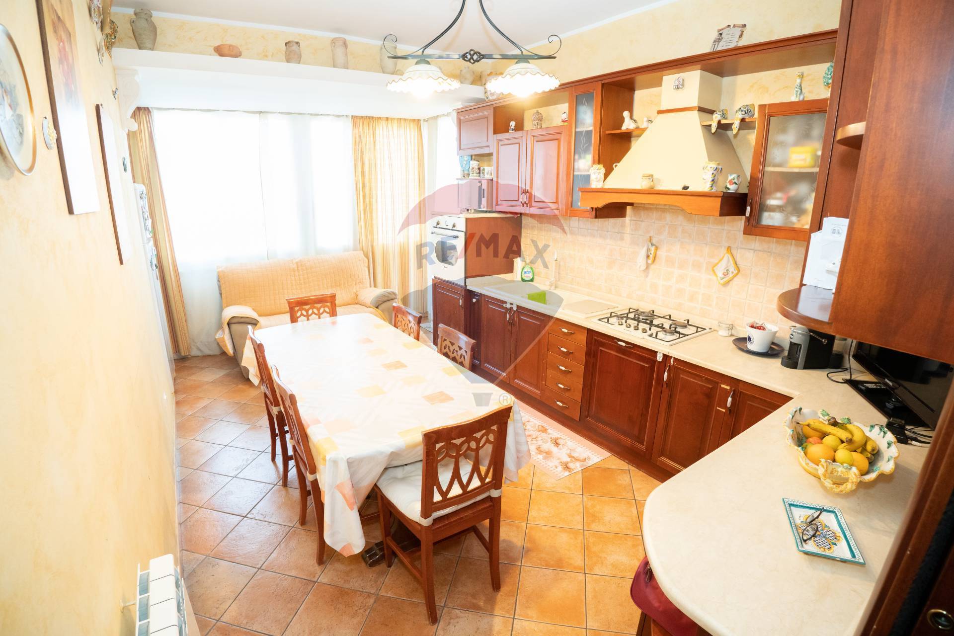 d) Più avanti sulla sinistra troviamo una grande e luminosa cucina super abitabile con grande finestra e porta per balconeterrazzino, che ospita barbecue in cemento;
