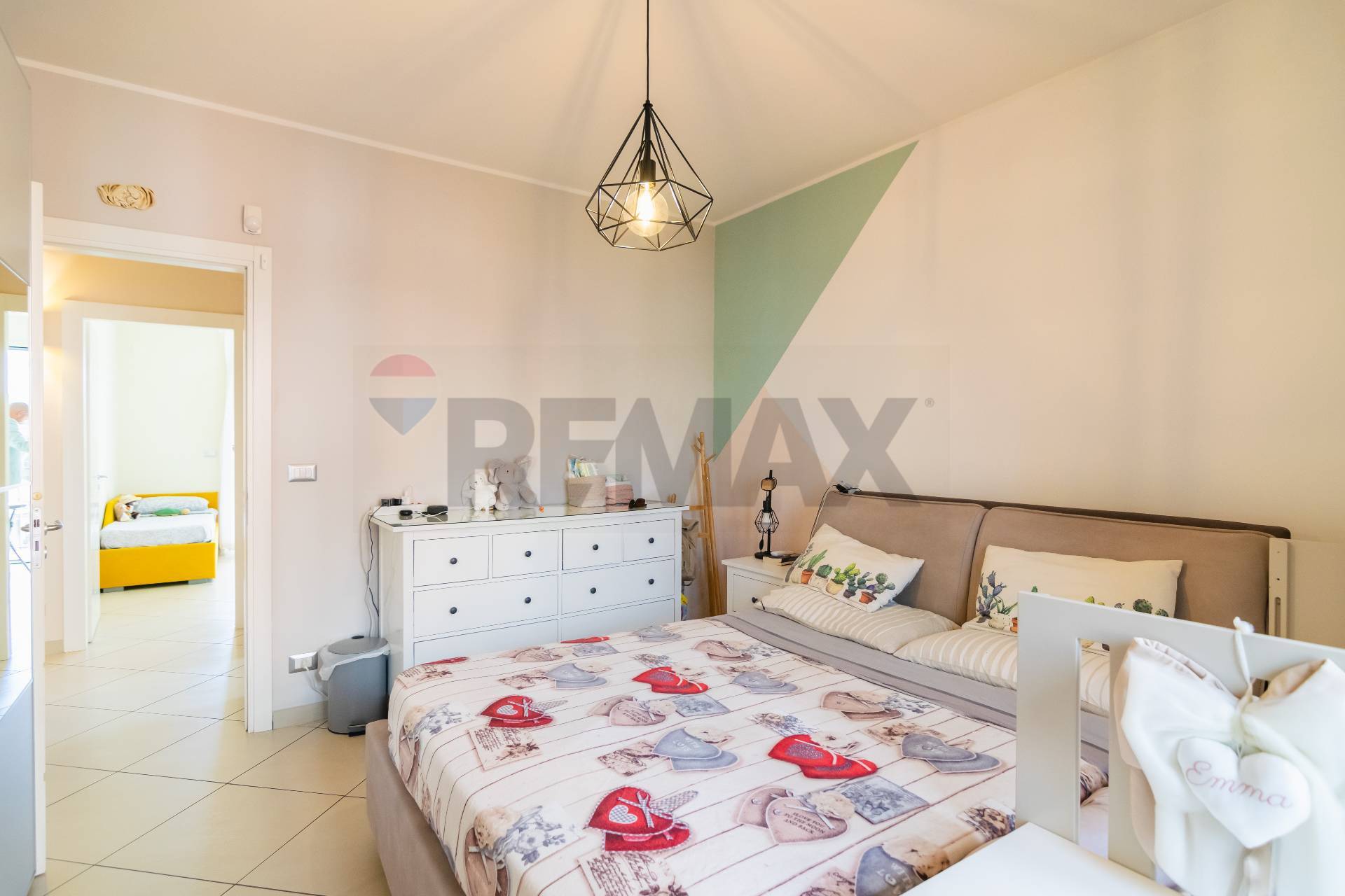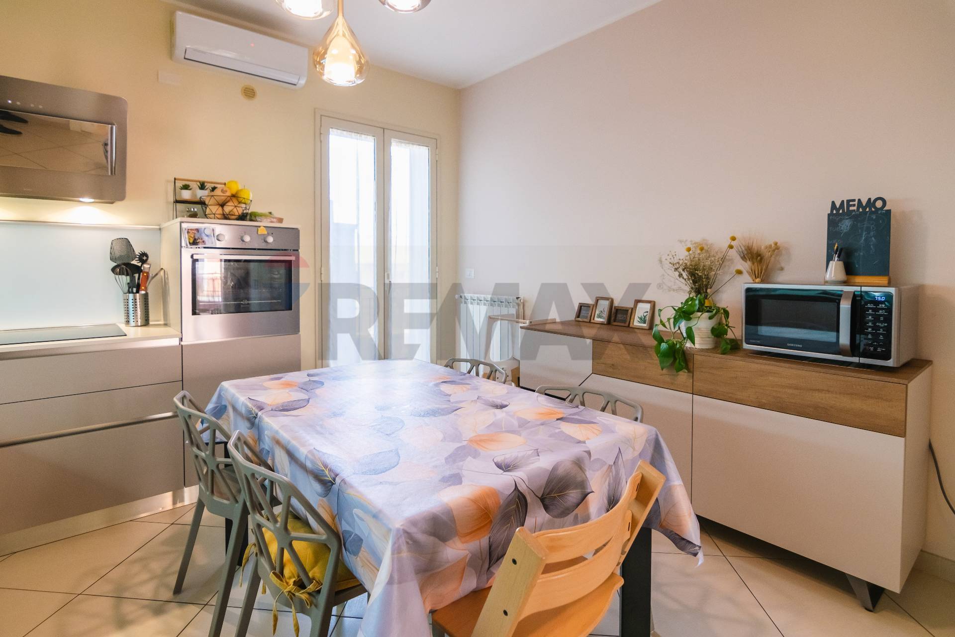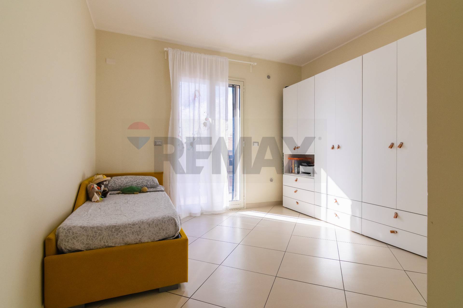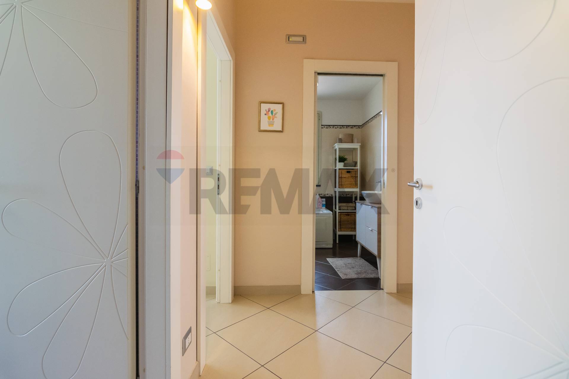 L’appartamento si apre su un luminoso salone con balcone, collegato tramite una porta a scrigno alla comoda cucina abitabile, anch’essa dotata di balcone che assicura una doppia esposizione e un’ottima luminosità.