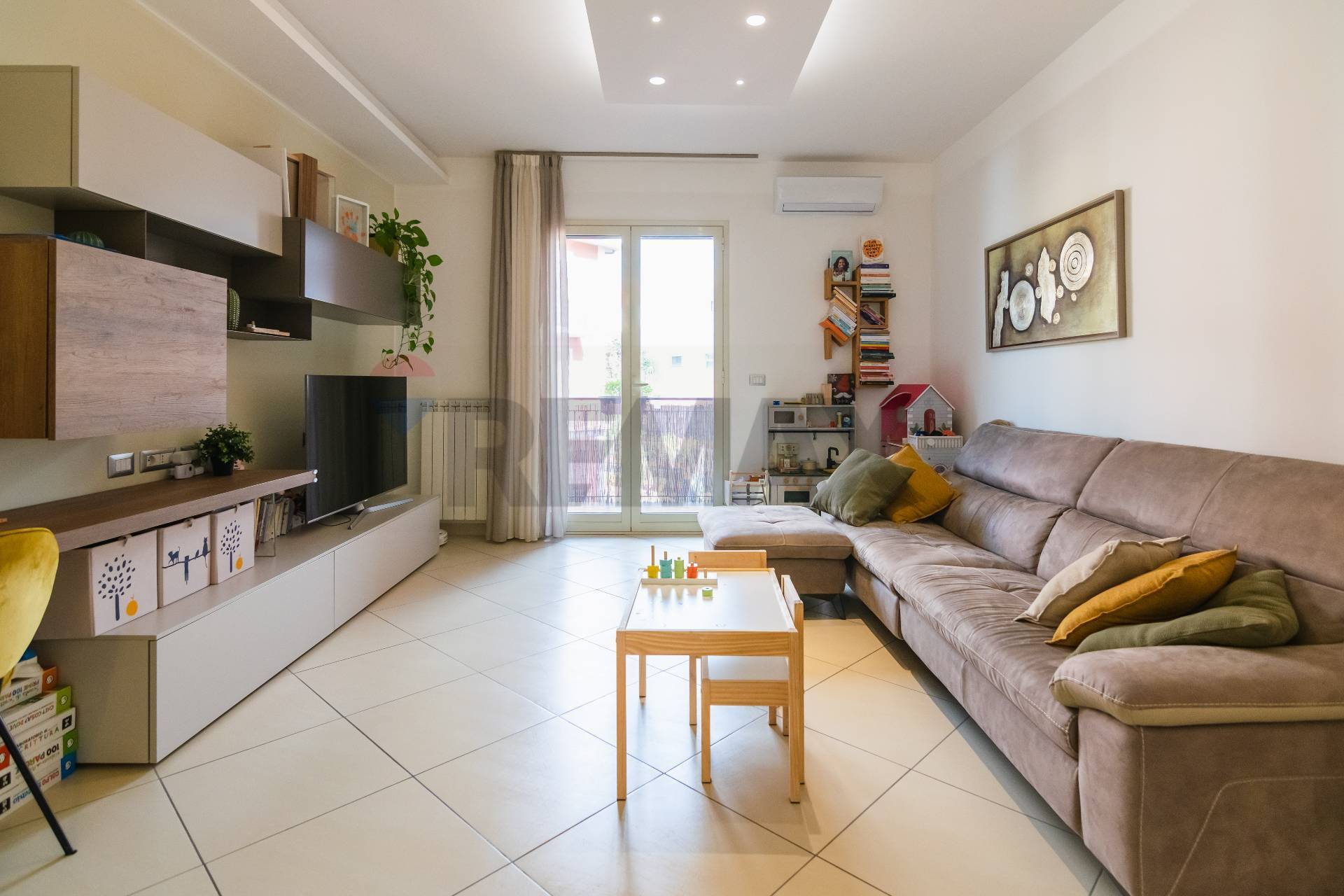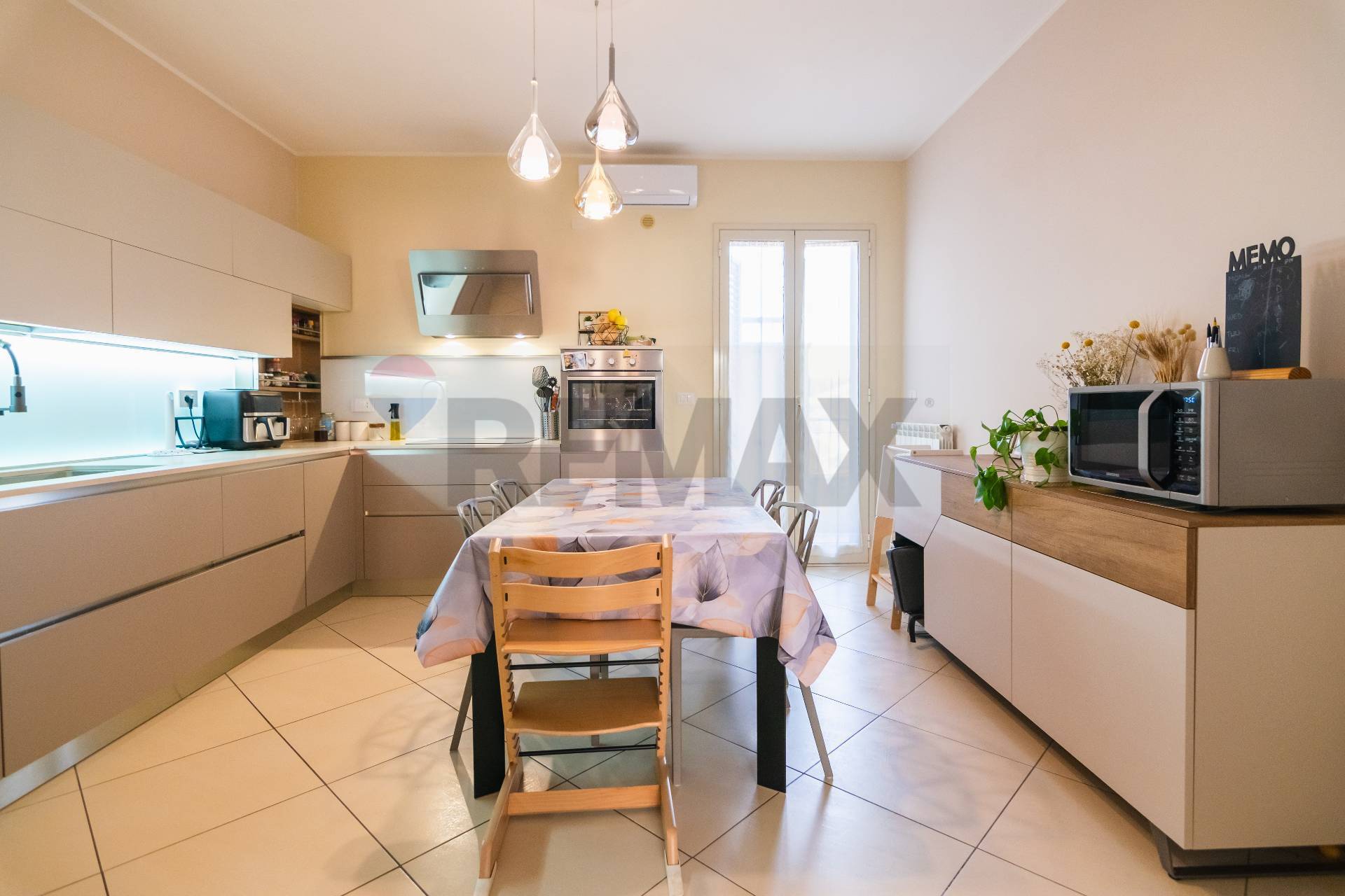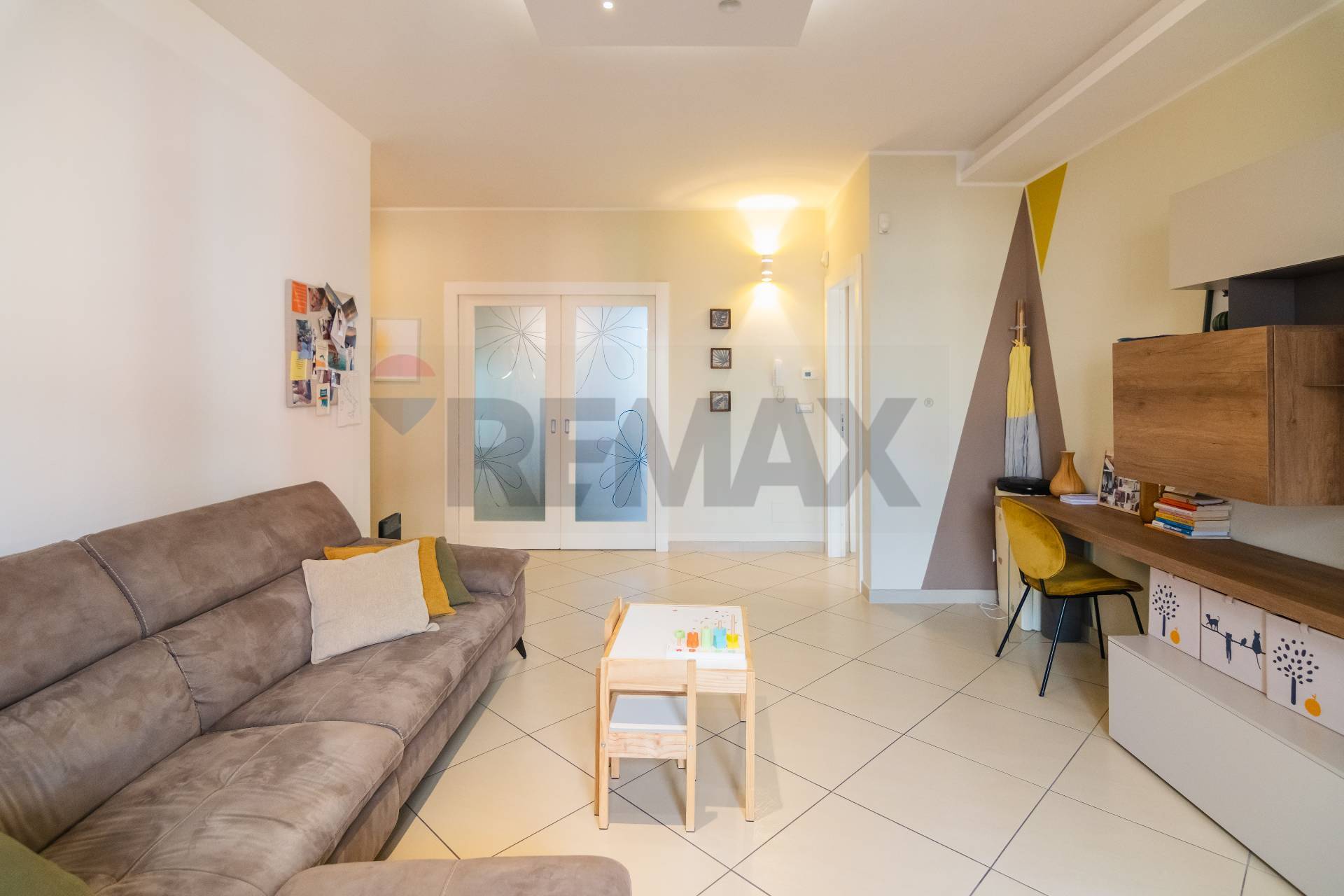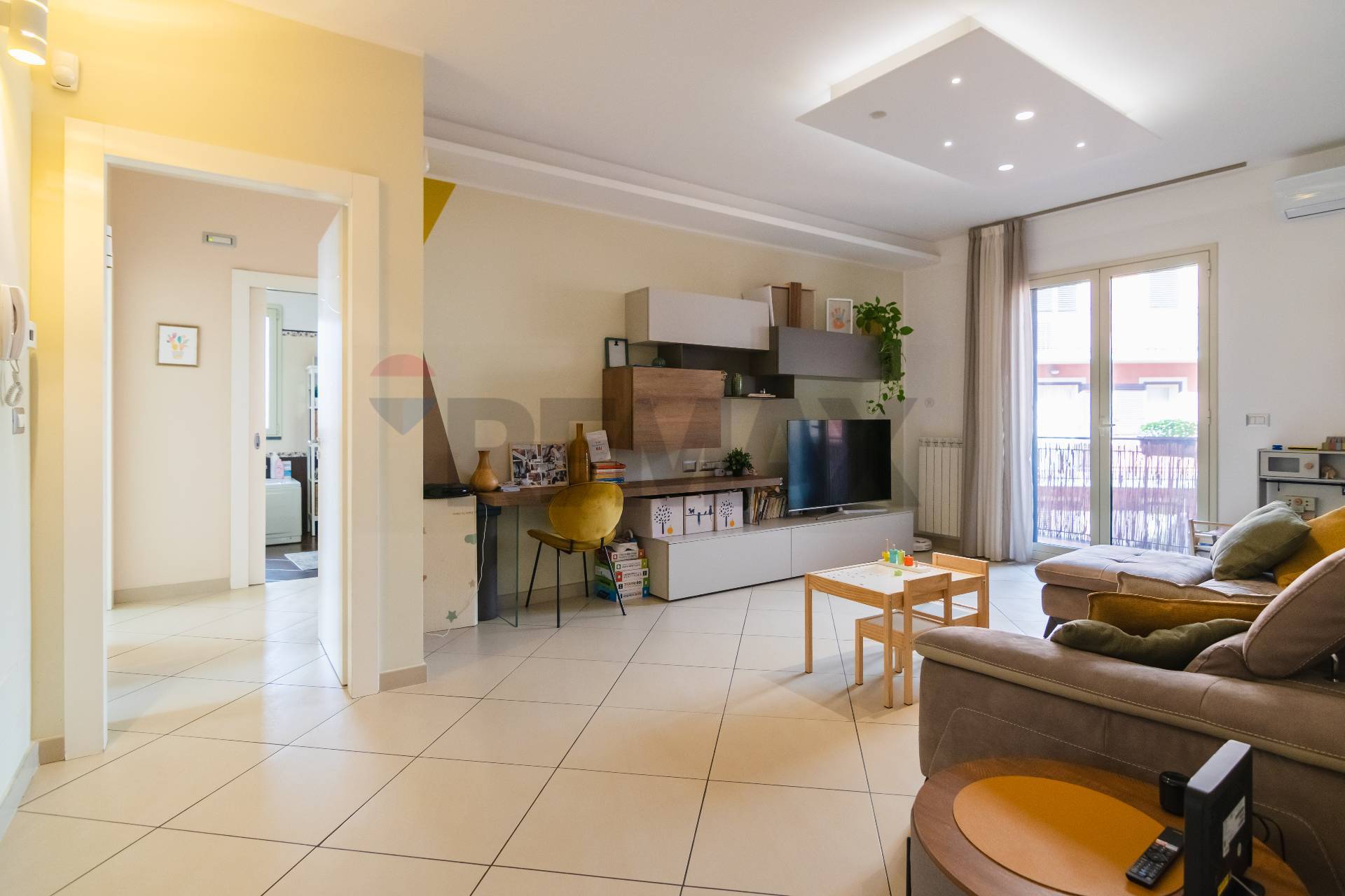 L’appartamento si apre su un luminoso salone con balcone, collegato tramite una porta a scrigno alla comoda cucina abitabile, anch’essa dotata di balcone che assicura una doppia esposizione e un’ottima luminosità.