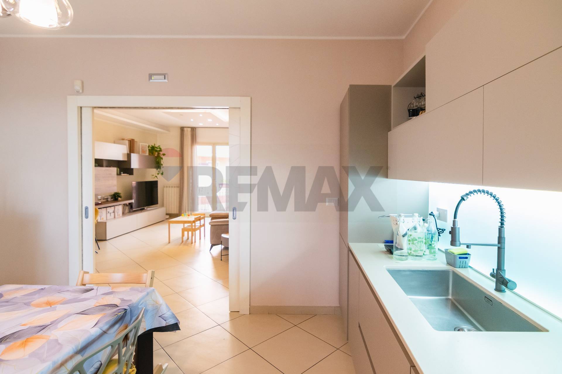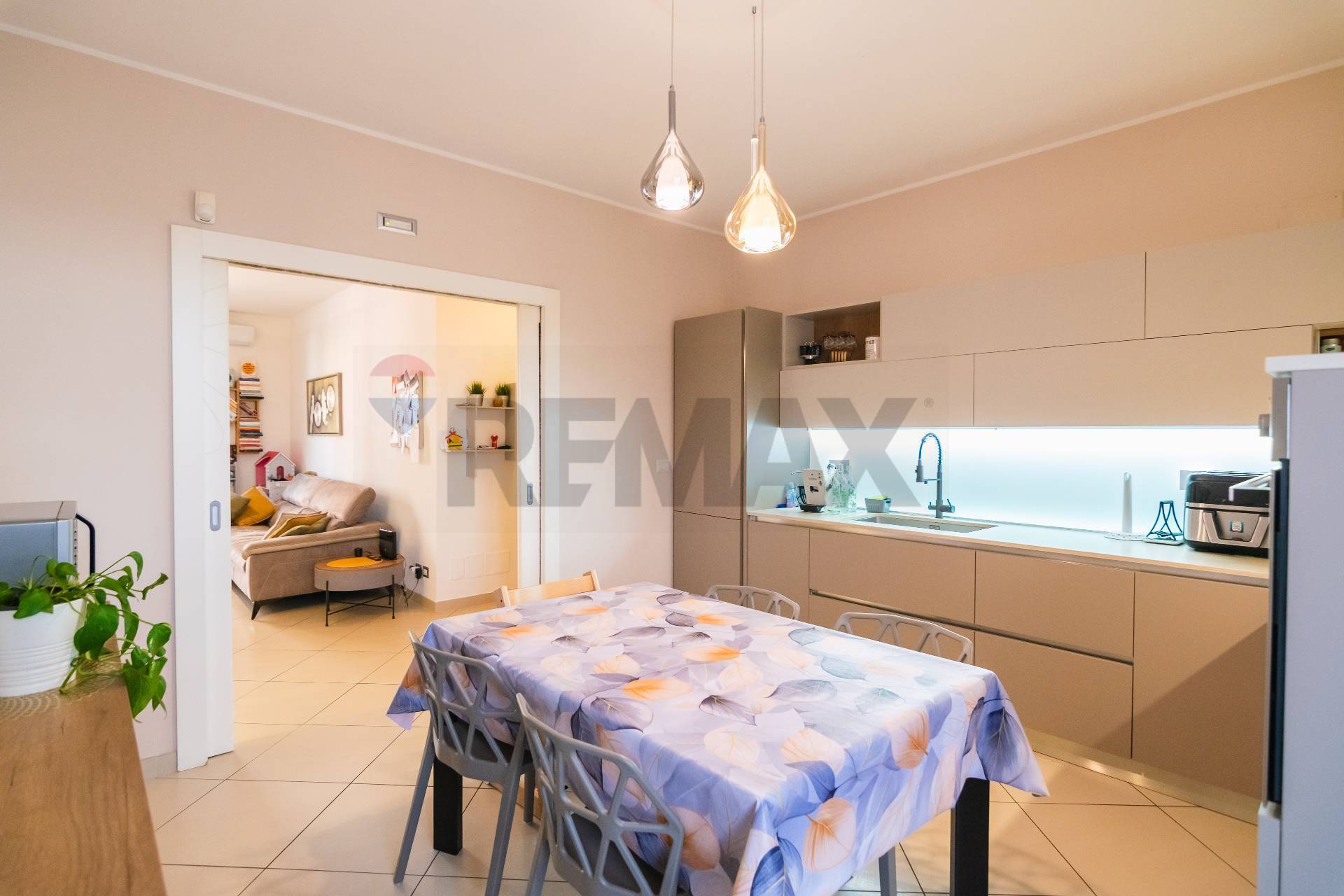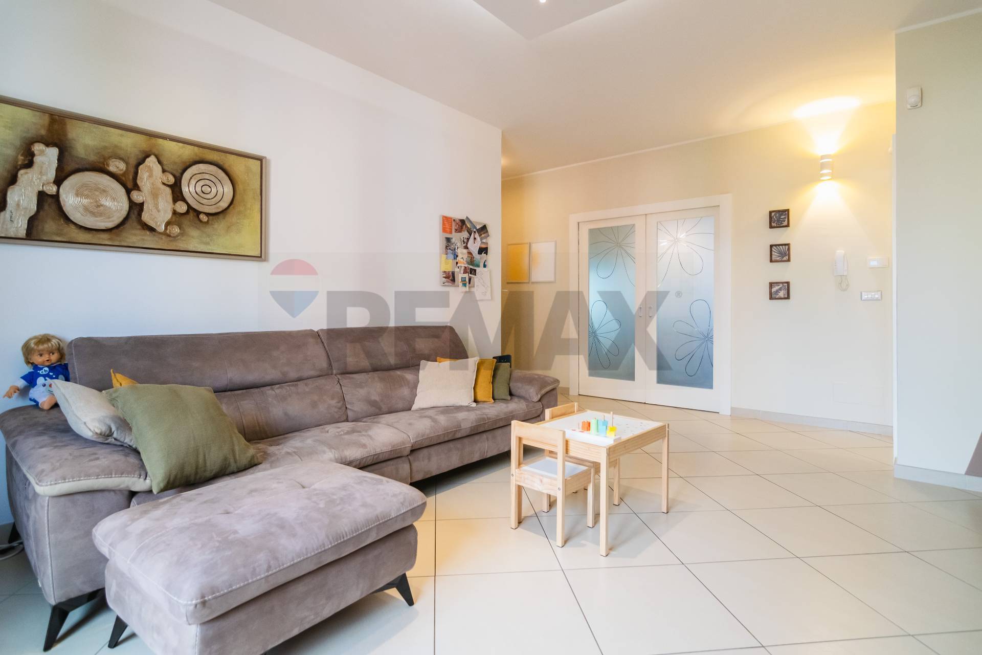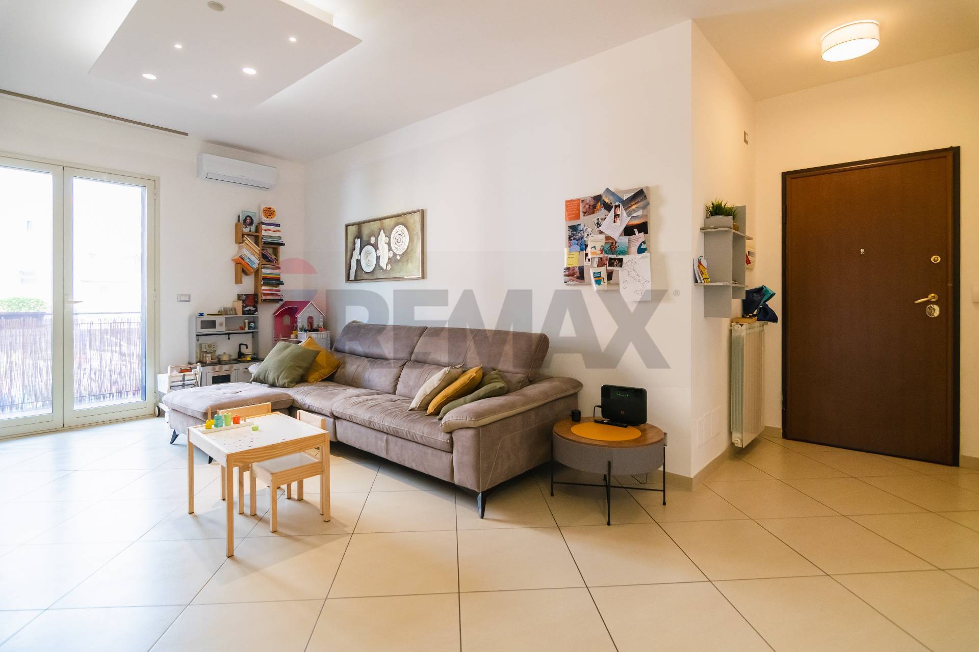 L’appartamento si apre su un luminoso salone con balcone, collegato tramite una porta a scrigno alla comoda cucina abitabile, anch’essa dotata di balcone che assicura una doppia esposizione e un’ottima luminosità.