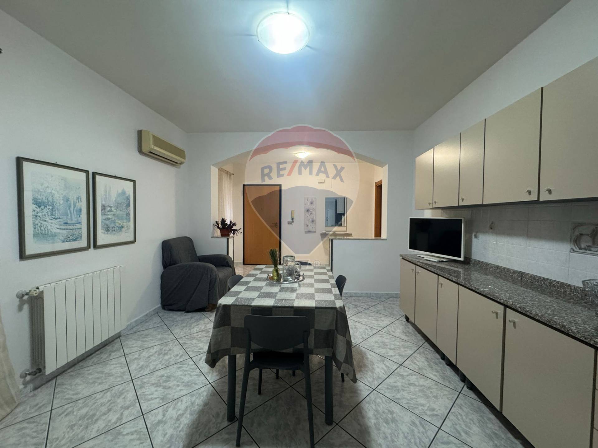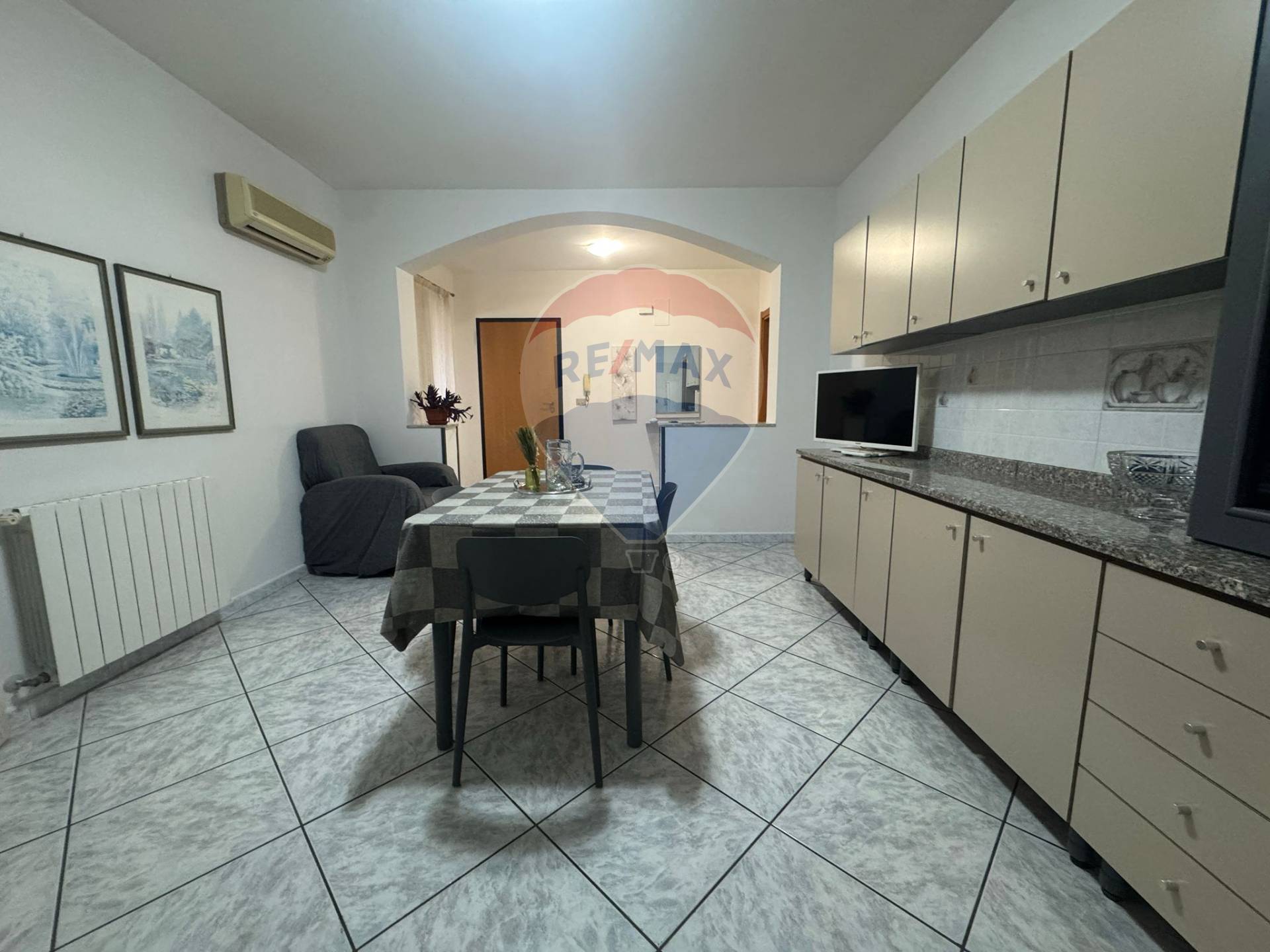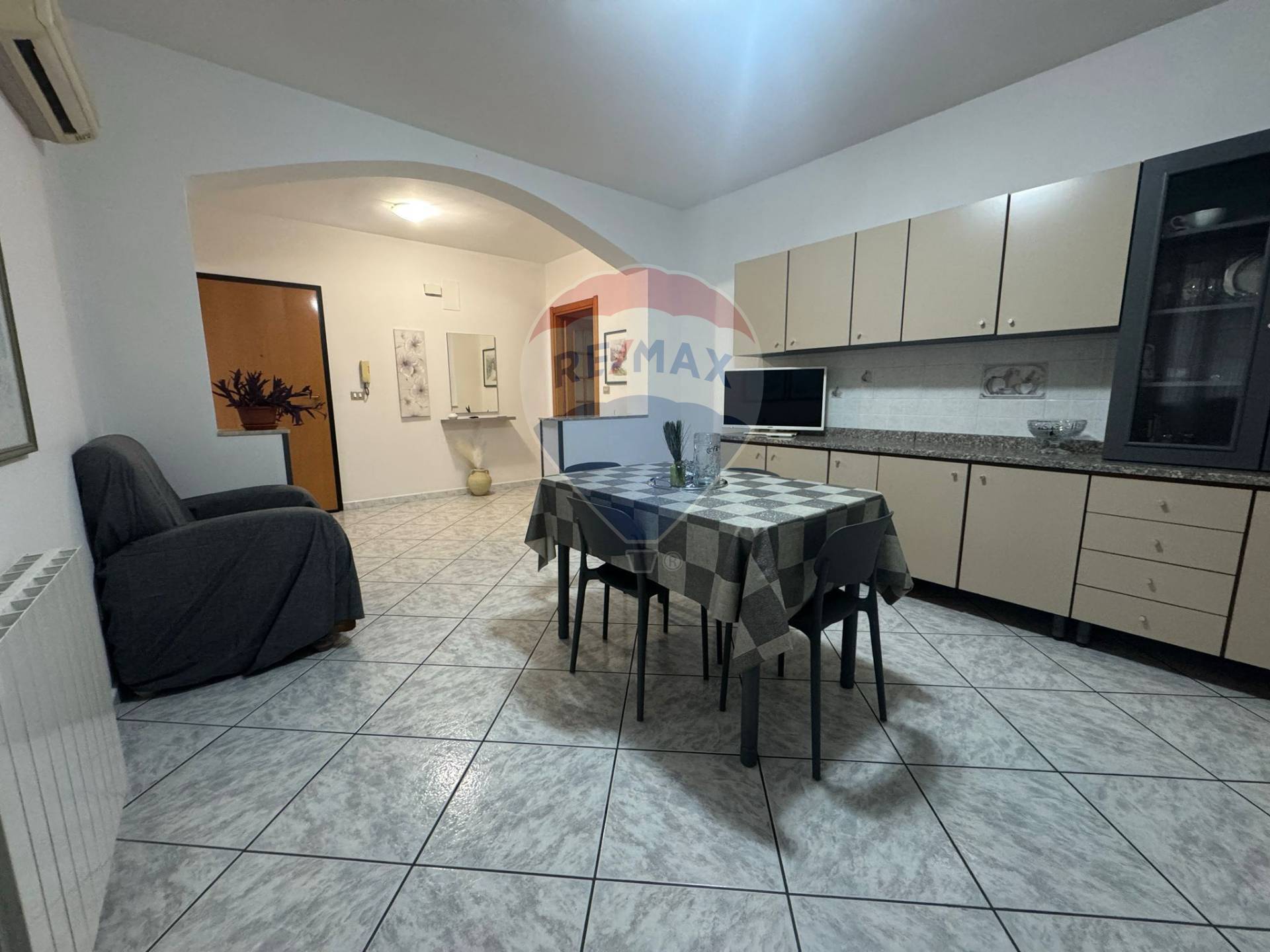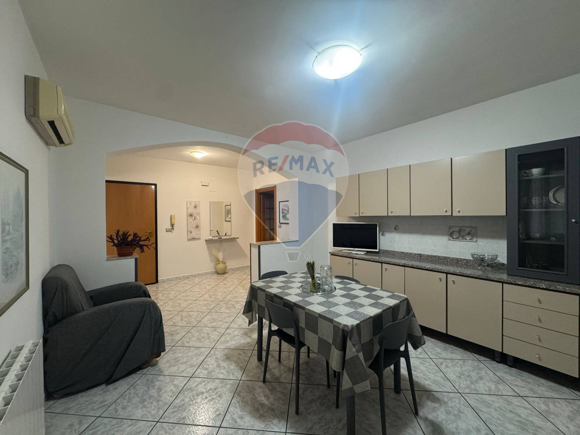 L’appartamento è arredato ed è composto da: ingresso, cucina-soggiorno, due camere da letto di cui uno con bagno in camera, ripostiglio/lavanderia e bagno.