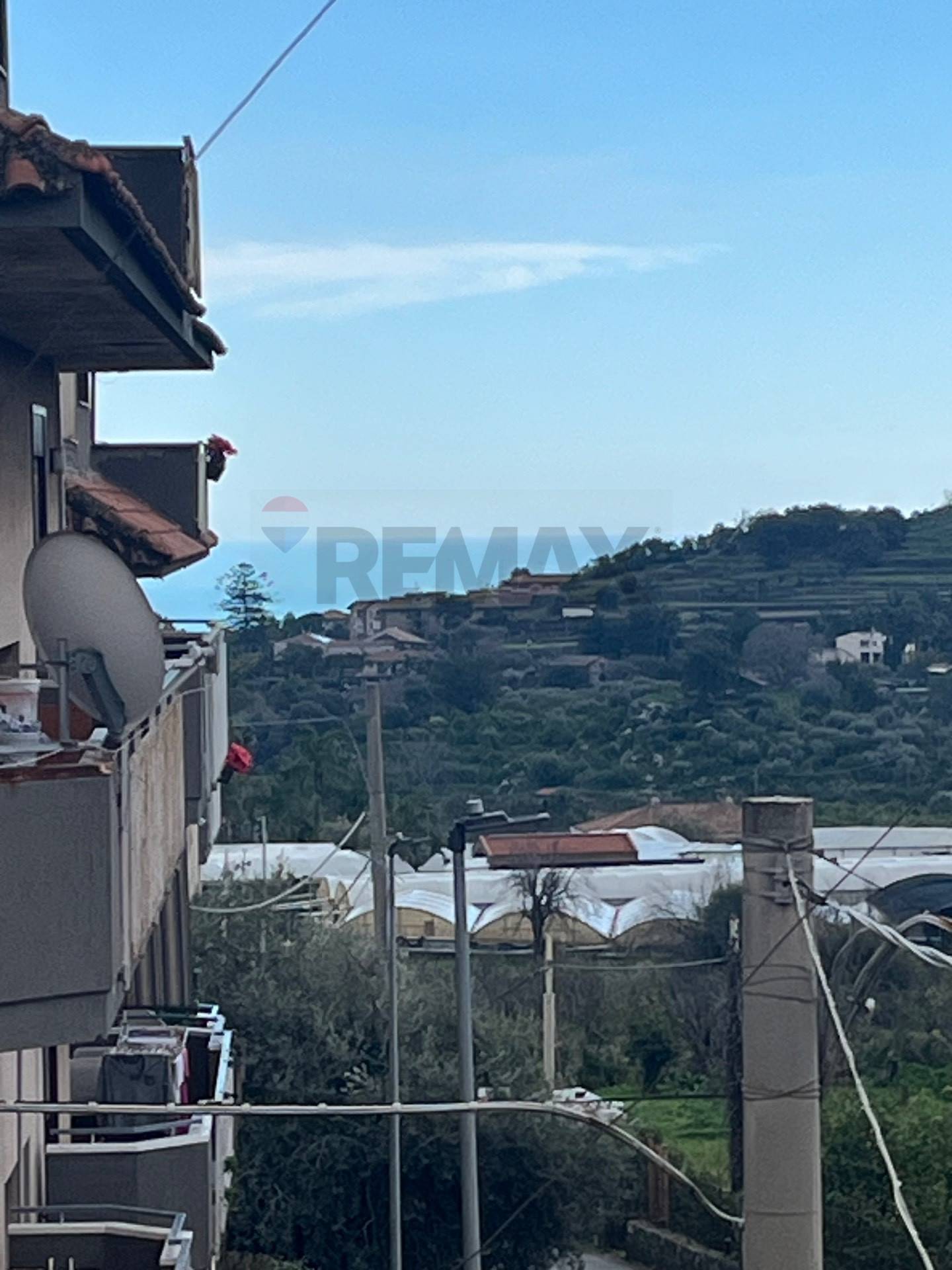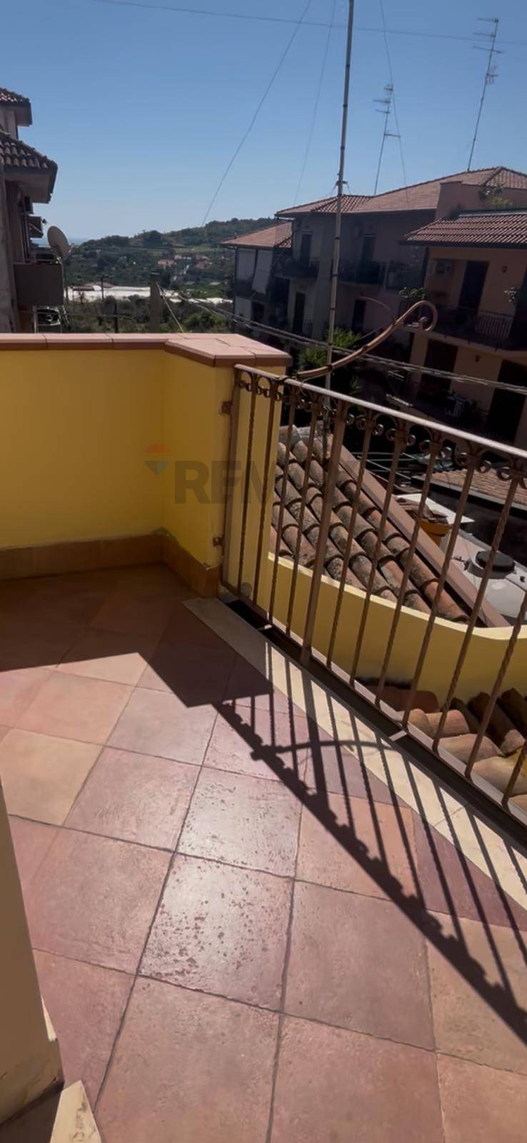 Dal piano superiore si accede a un balcone con affaccio sul terrazzo sottostante, dal quale è possibile godere di uno scorcio di vista mare in profondità.