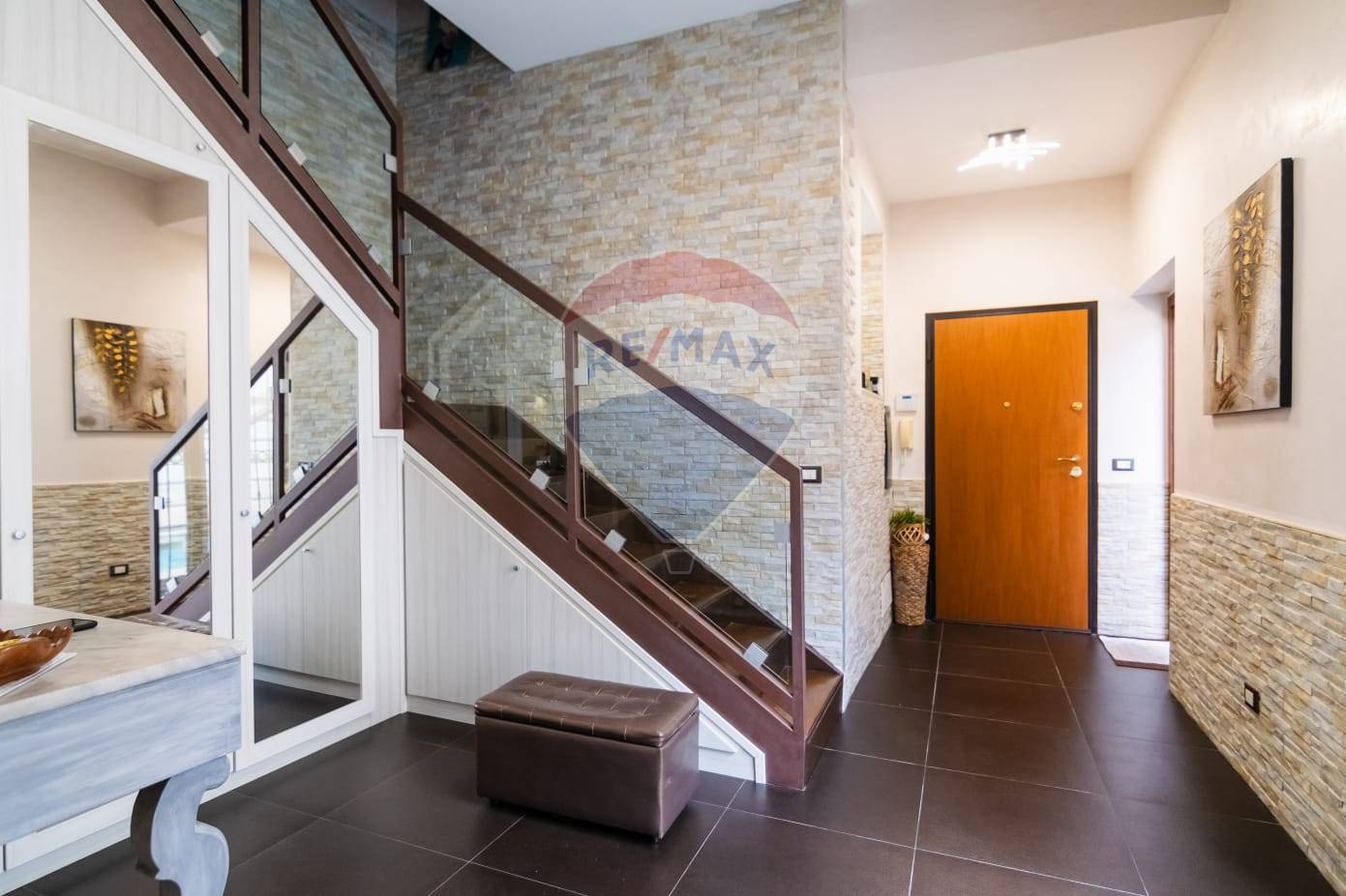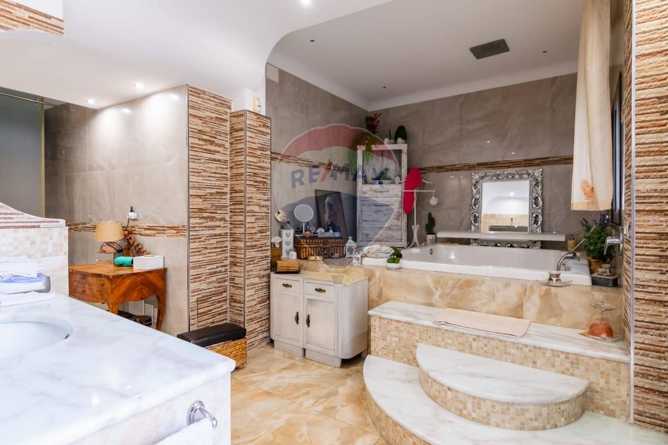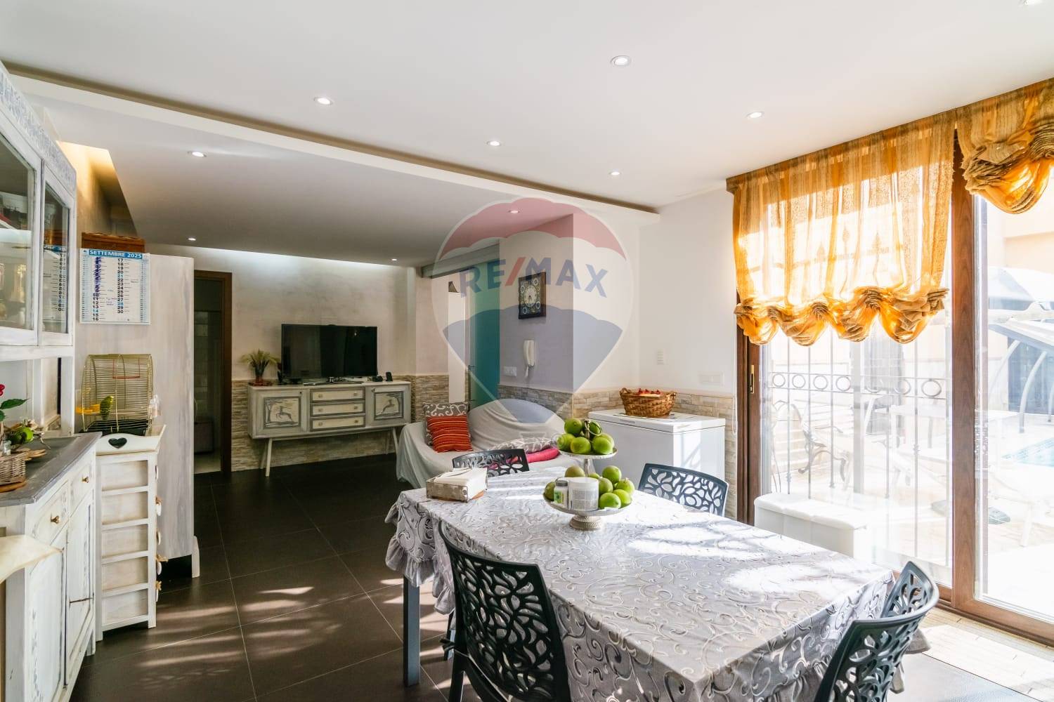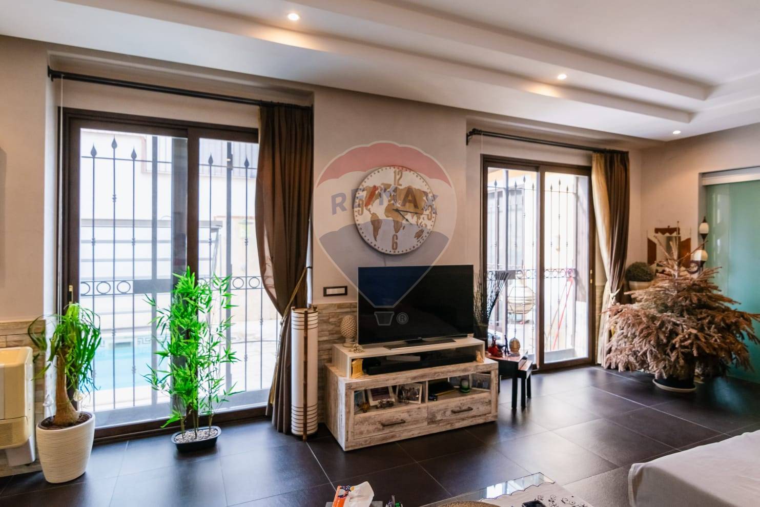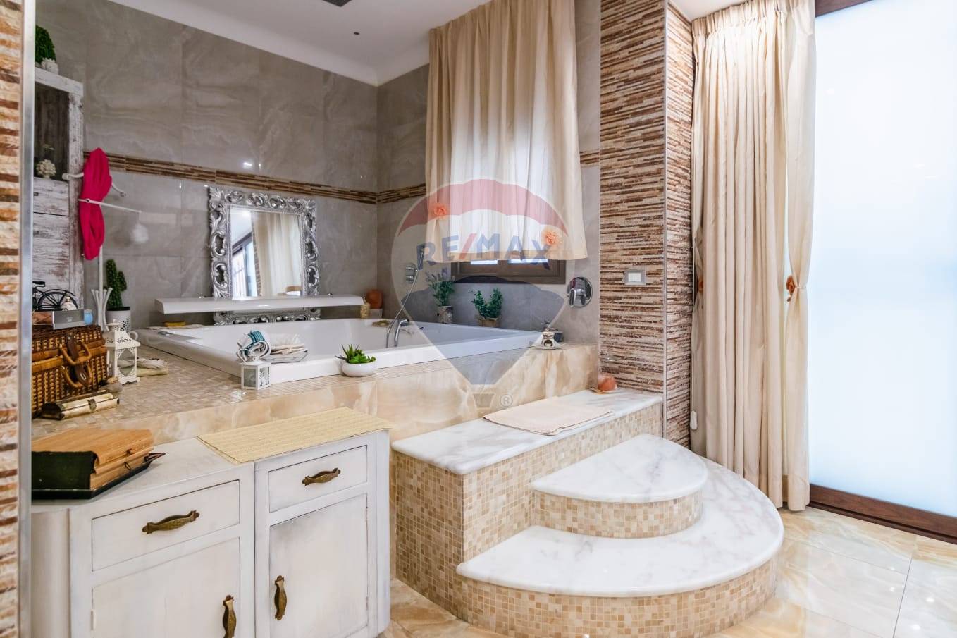 Al piano terra: ingresso su salone, bagno di rappresentanza con vasca idromassaggio, grande cucina abitabile, cortile interno dotato di piscina coperta, comoda lavanderia.