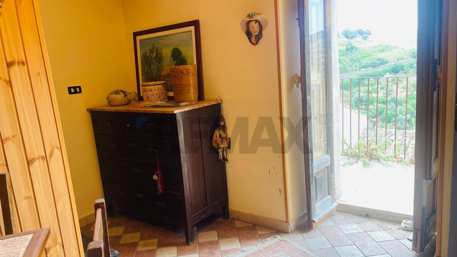 da una scala in pietra nera si scende al piano inferiore dove si trova una prima camera con accesso su terrazzino