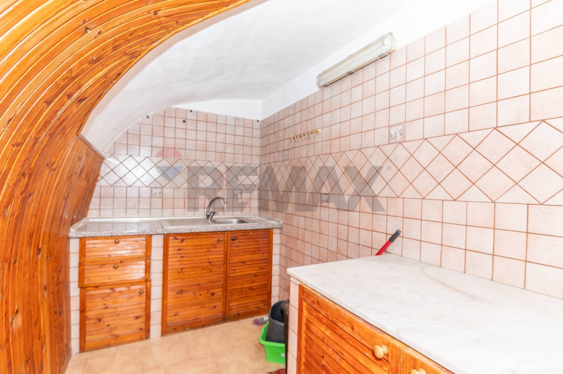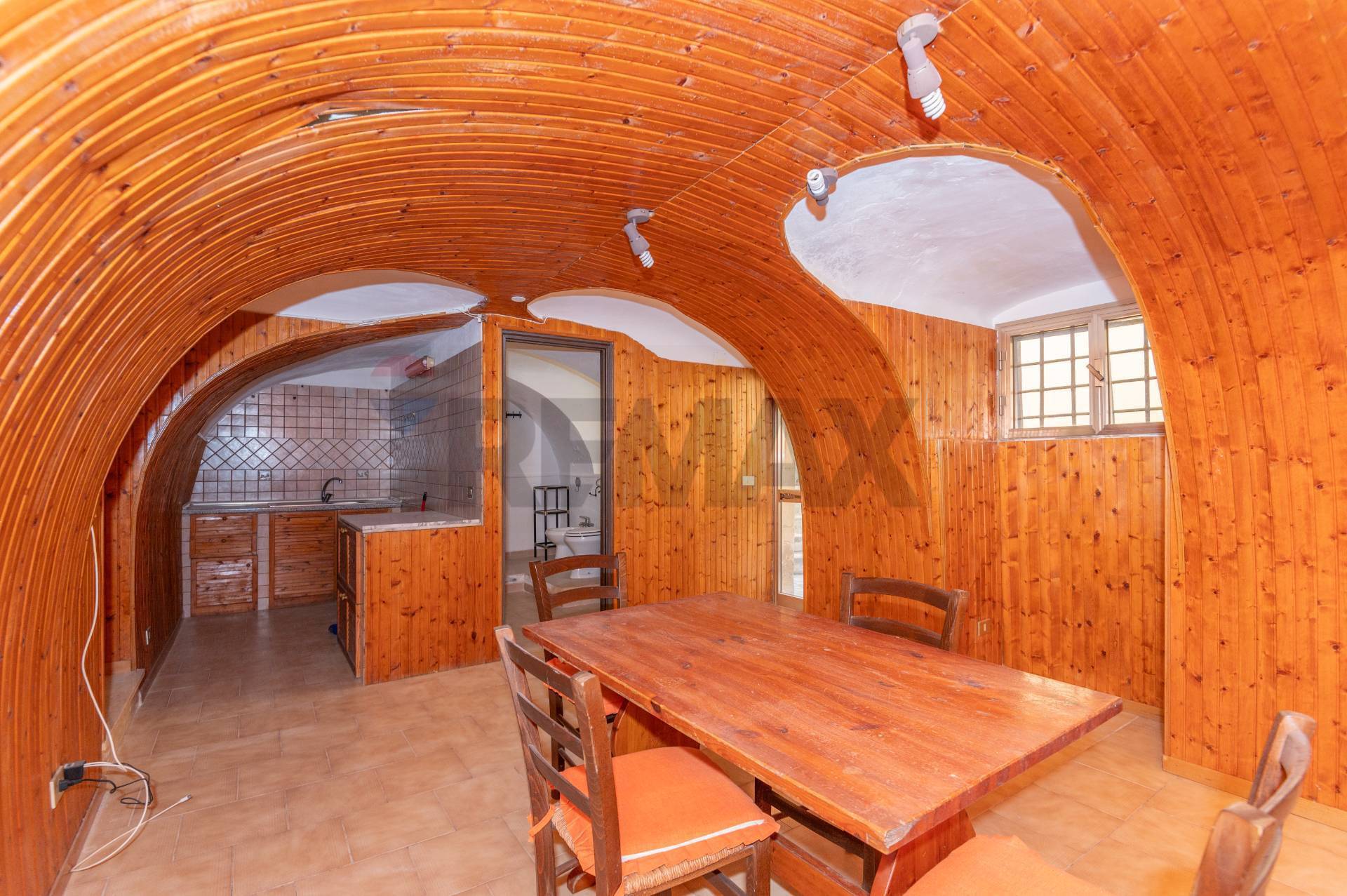 Accedendo si apre un ampio locale che, tramite una scala a chiocciola, conduce a un soppalco attualmente adibito a camera da letto. Sul lato opposto, alcuni gradini conducono a un antico dammuso in pietra, oggi destinato a zona giorno con angolo cottura, sala da pranzo e bagno.