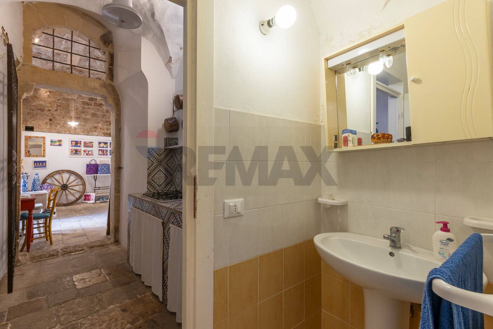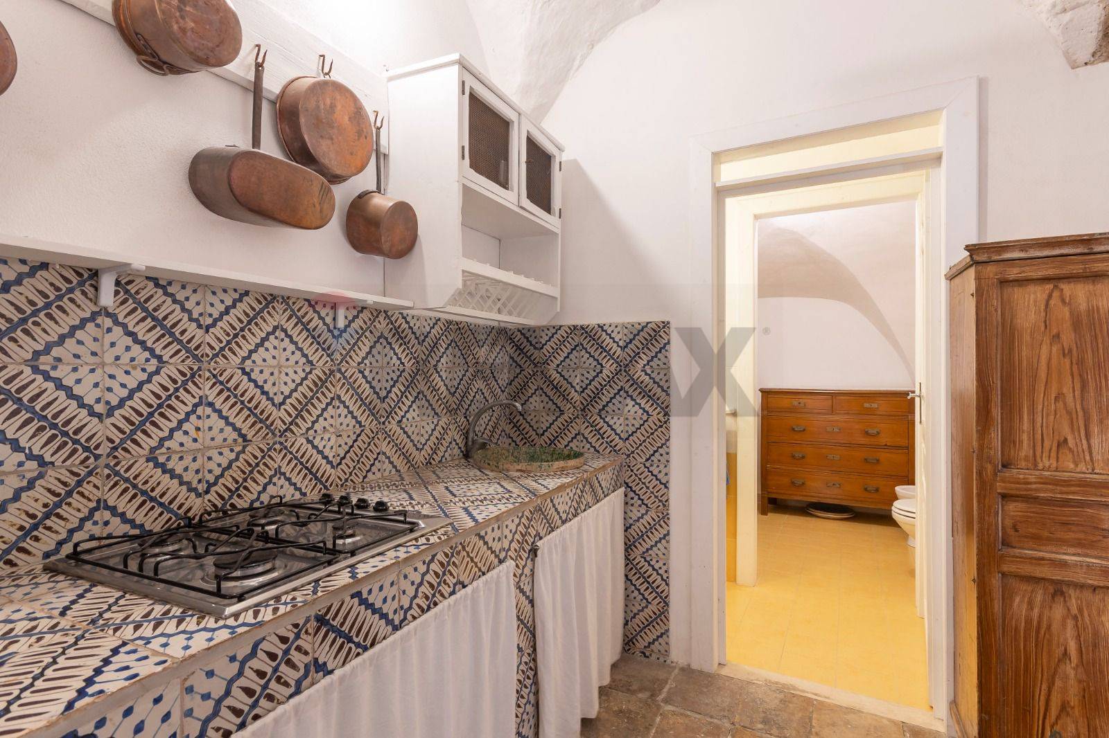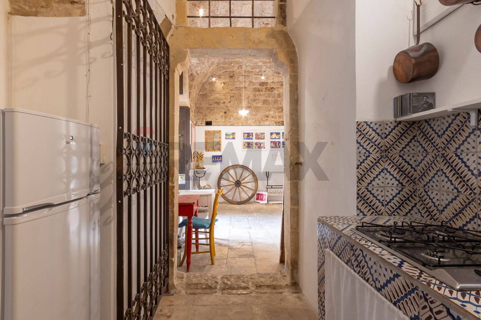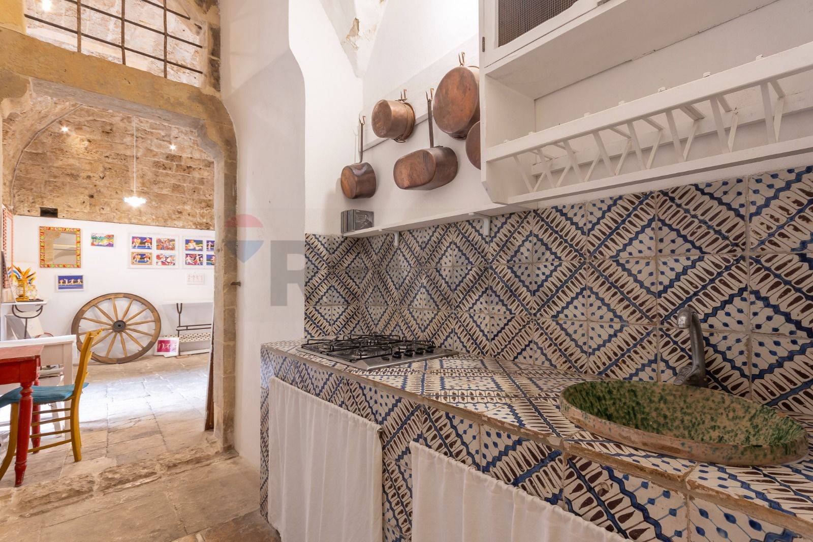 La zona living si estende sino ad arrivare ad una preziosa cucina in muratura, costruita secondo le rigorose tecniche siciliane e contraddistinta da maioliche originali risalenti al 1800.