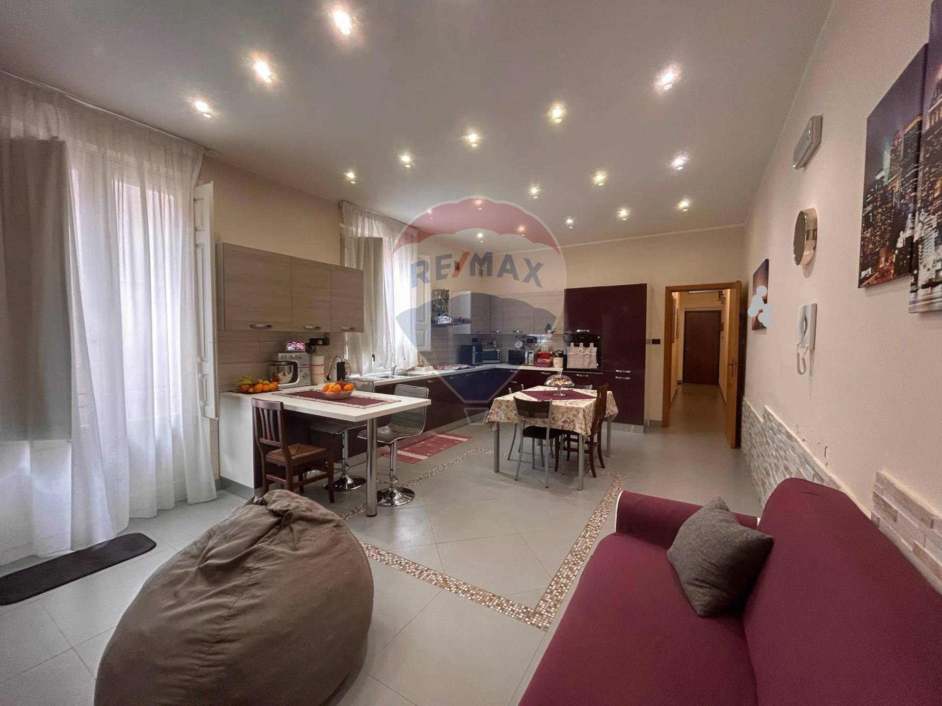 Un corridoio ci conduce al bagno e a seguire raggiungiamo la grande cucina/soggiorno anch’essa con affaccio sul terrazzino.