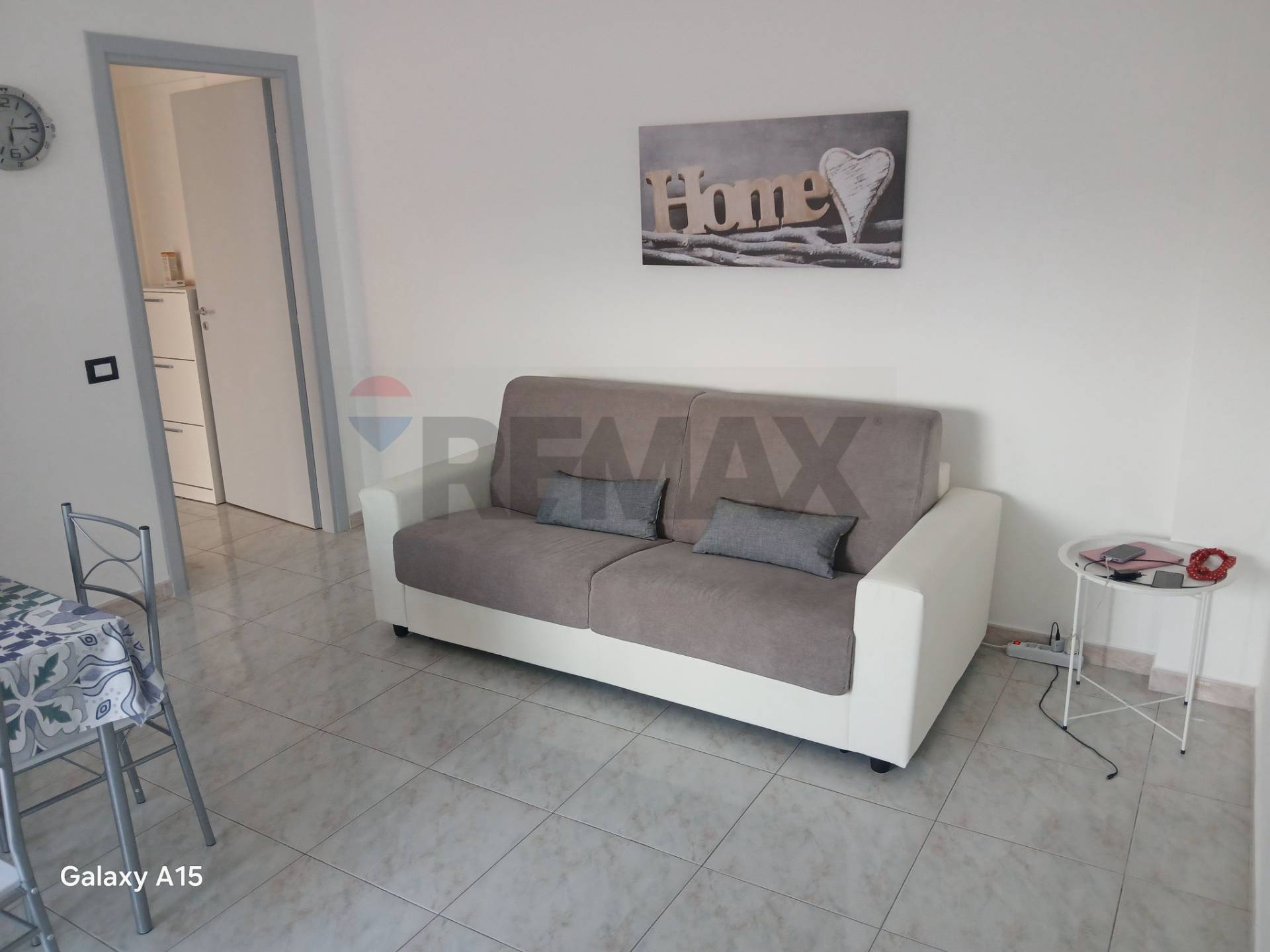 La cucina abitabile è completamente attrezzata e il soggiorno è arredato con divano, tavolo e sedie.