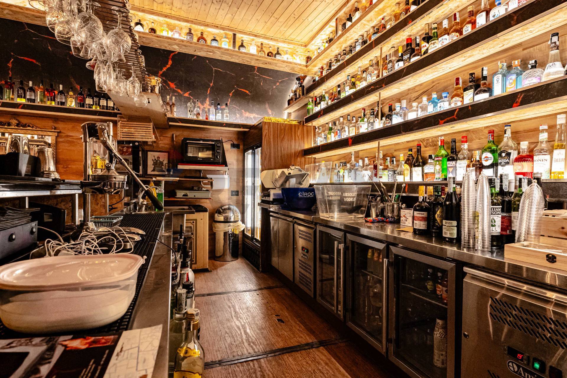 Attrezzatura Professionale: 4 frigoriferi (banco e vetrina), congelatore, affettatrice, forno, piastra e postazione barman completa.