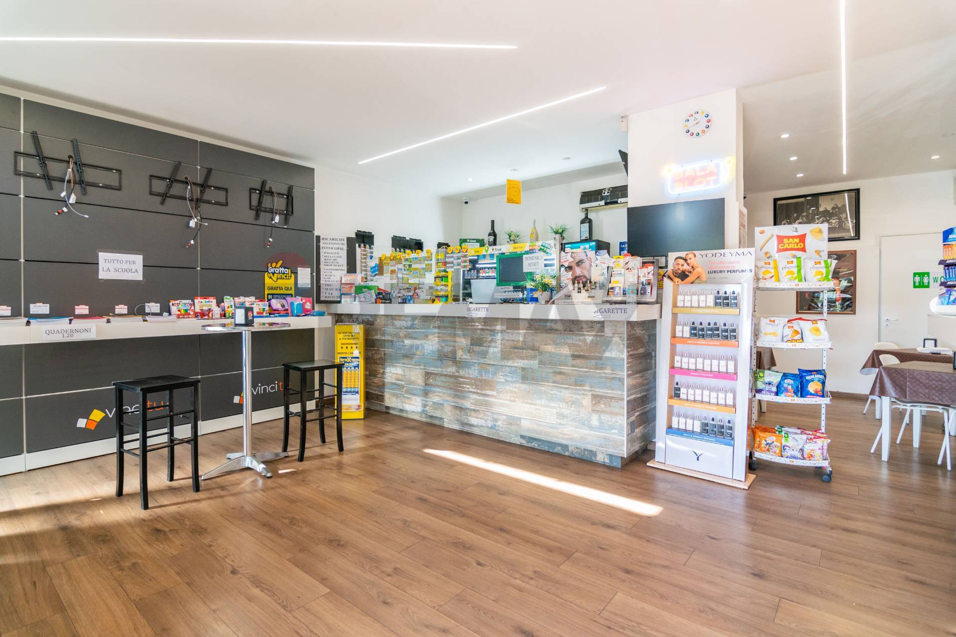Attualmente locato a rivendita di tabacchi, con attività di bar e ristorazione.