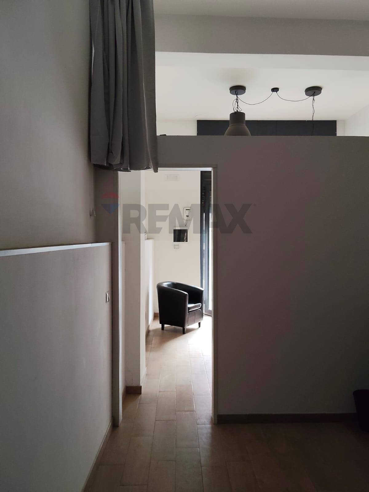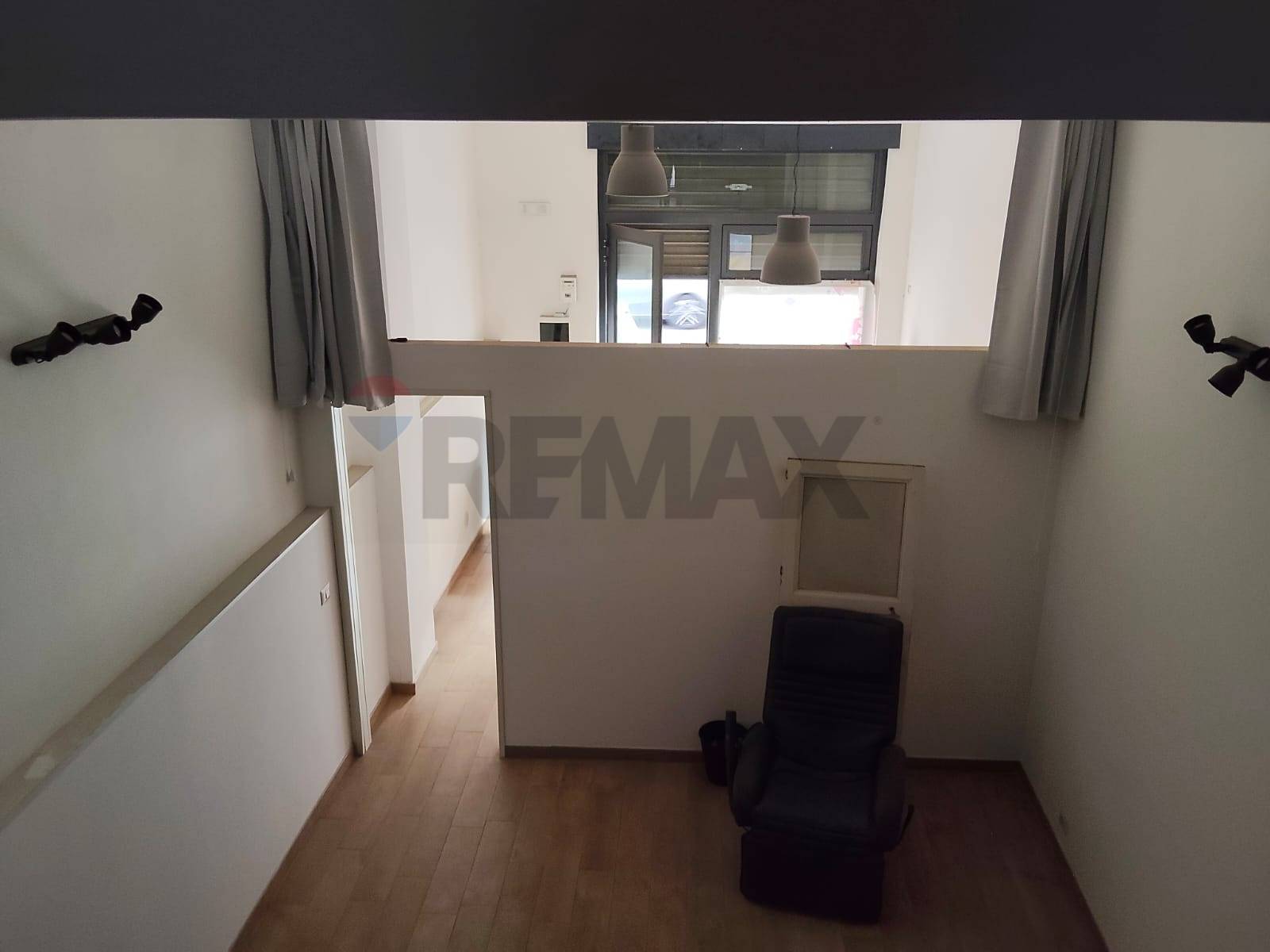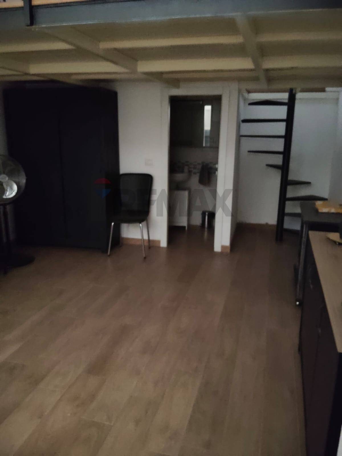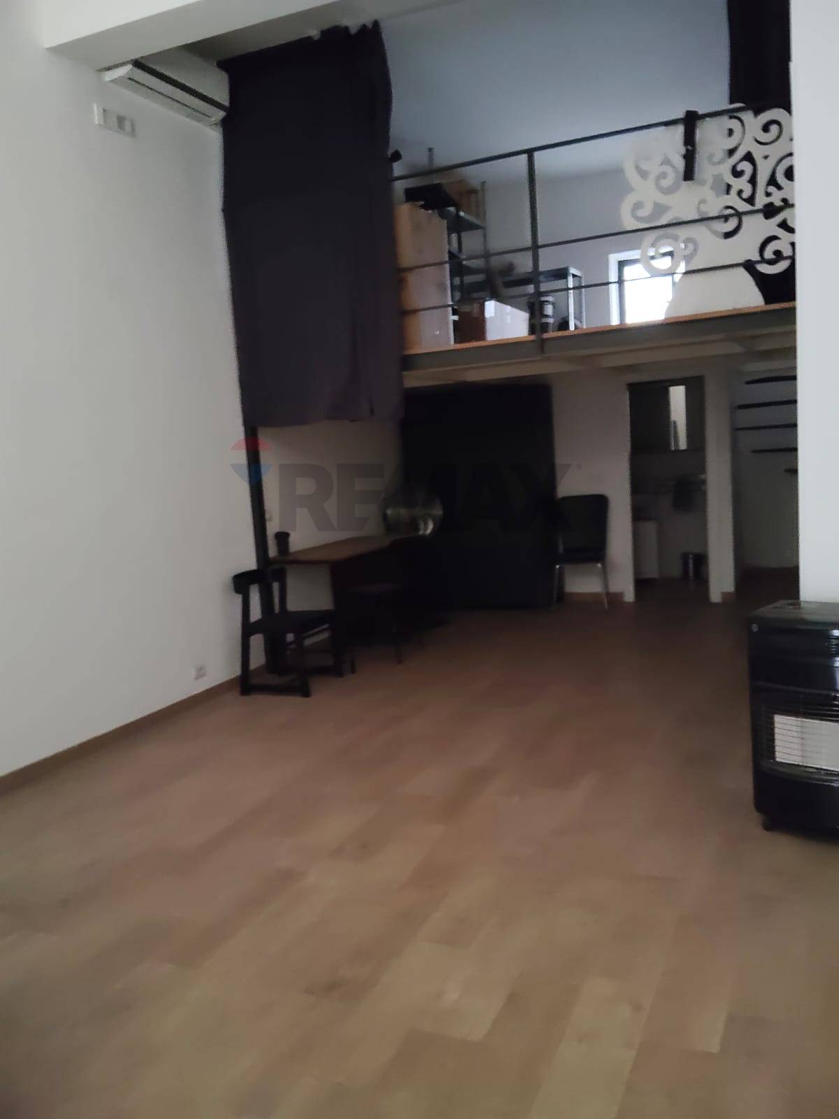Spazi funzionali: zona ingresso/accoglienza (con parete divisoria in cartongesso removibile), ampio ambiente posteriore, bagno e soppalco con finestra.