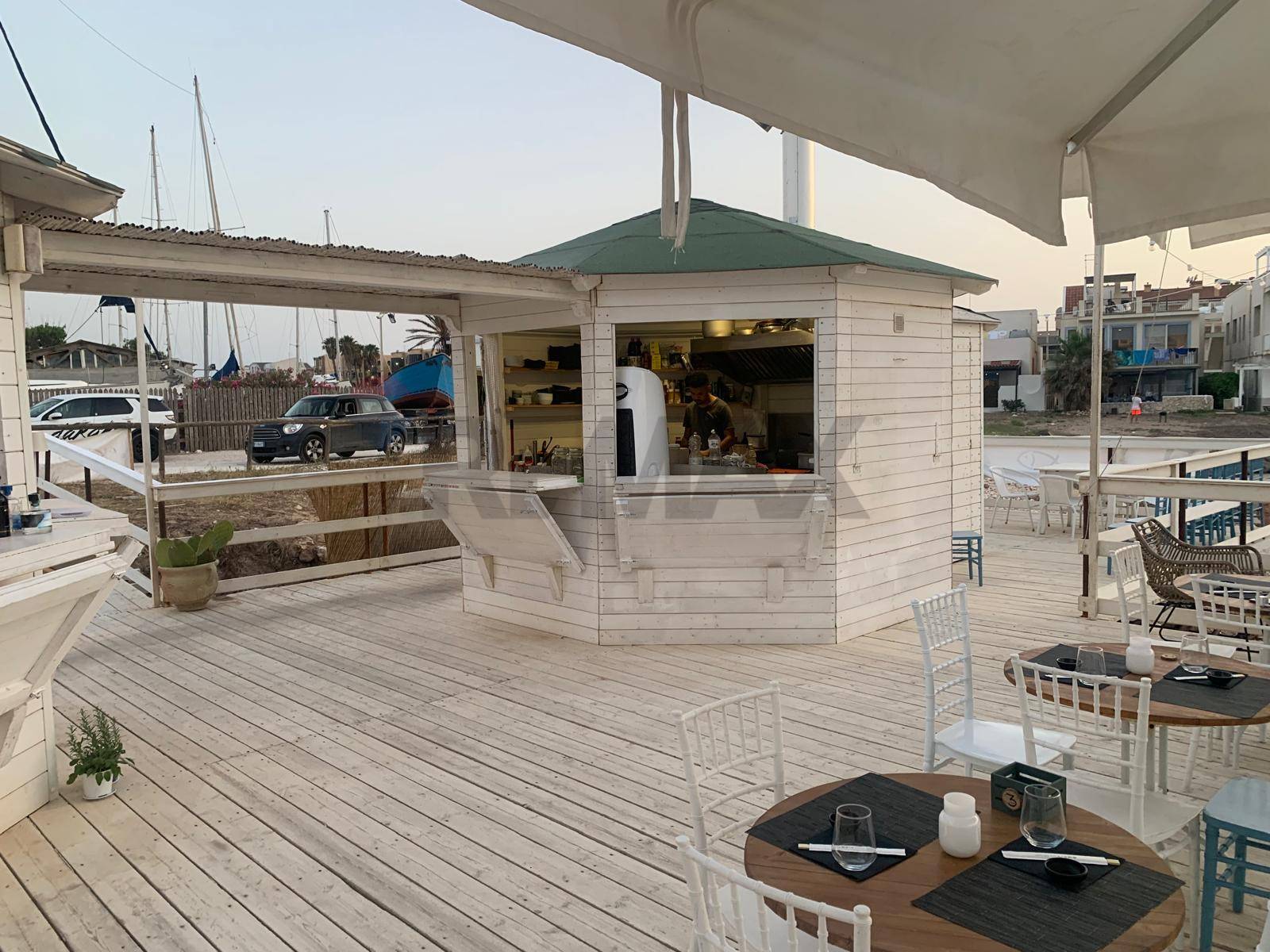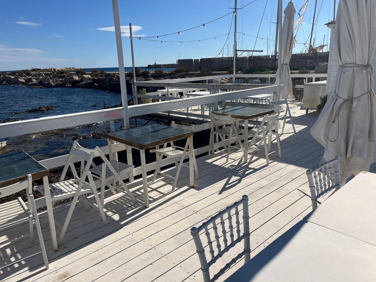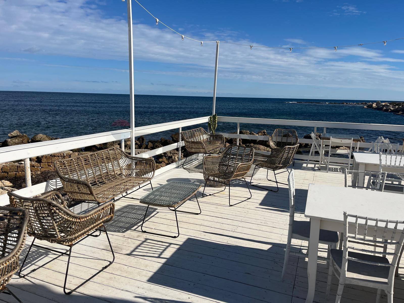 The structure develops completely on the sea and extends over a total surface area of 300 square meters on which there are two different hexagonal structures on the sides, one dedicated to the cocktail bar and a structure exclusively dedicated to the kitchen, the large and well-distributed surface area, with a breathtaking sea view.