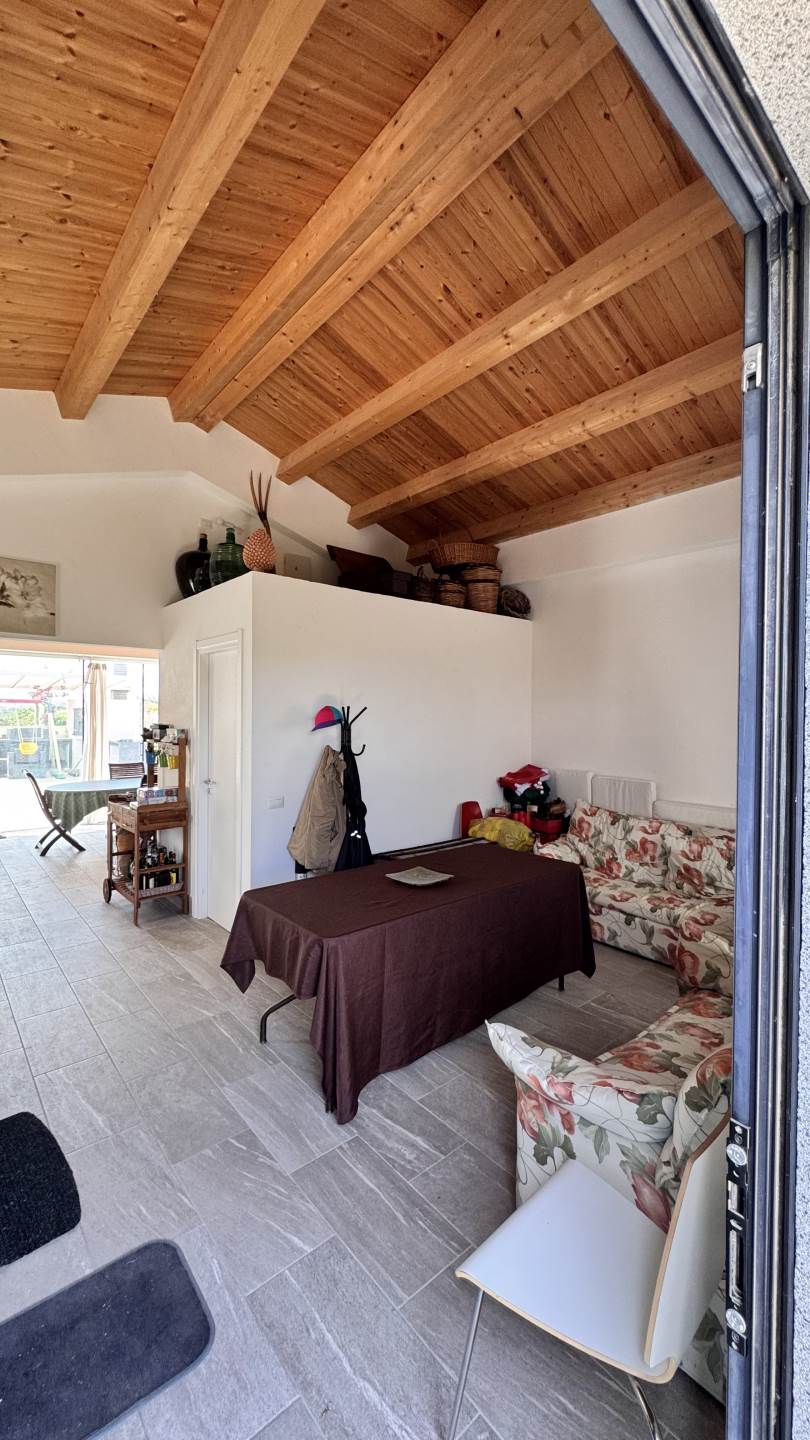 • Spaziosa zona cucina-soggiorno, caratterizzata da una grande porta finestrata elegante che si affaccia sulla veranda esterna, garantendo ampia luminosità e continuità tra gli spazi interni ed esterni;