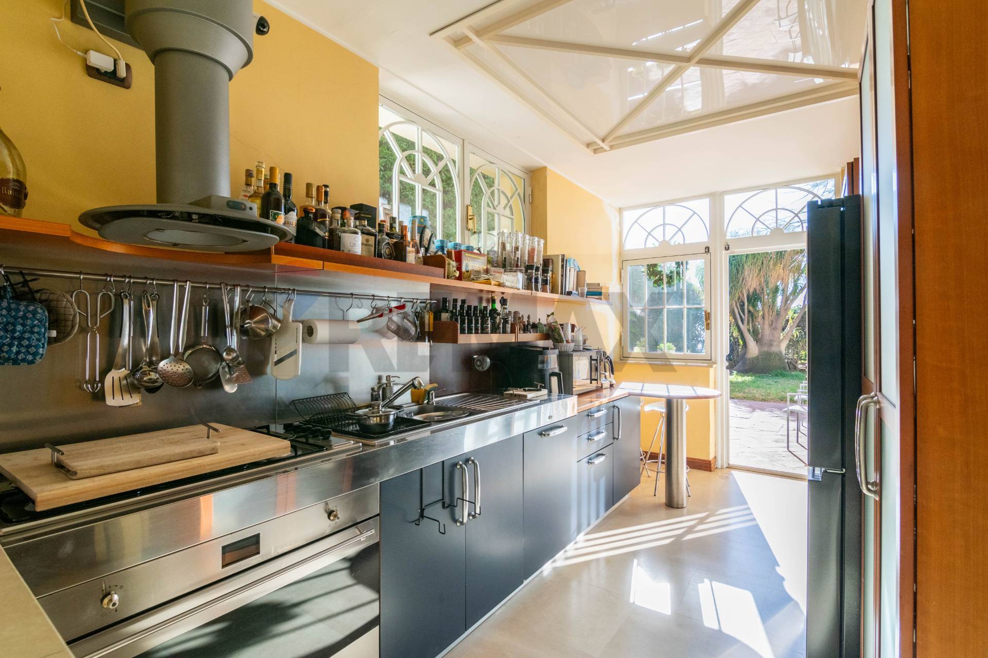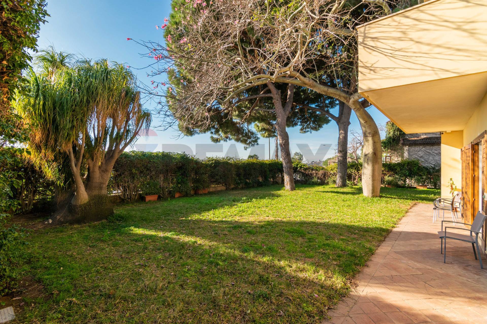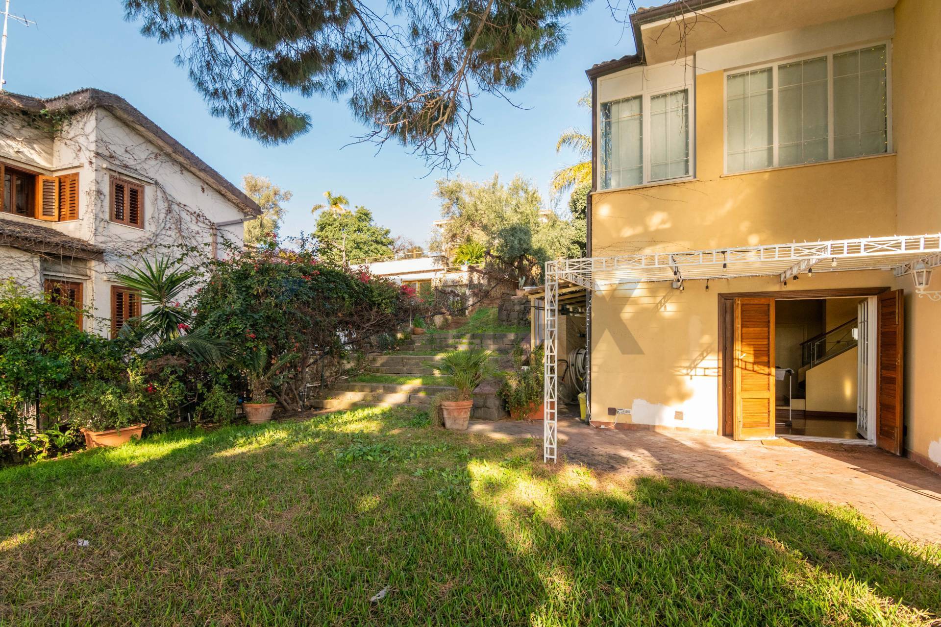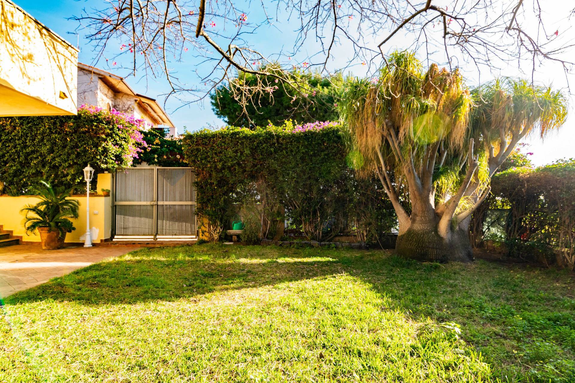 L’accesso alla proprietà è caratterizzato da un giardino scenografico, curato nei minimi dettagli e ornato da alberi di alto fusto che creano un’oasi privata di tranquillità e ombra mediterranea.