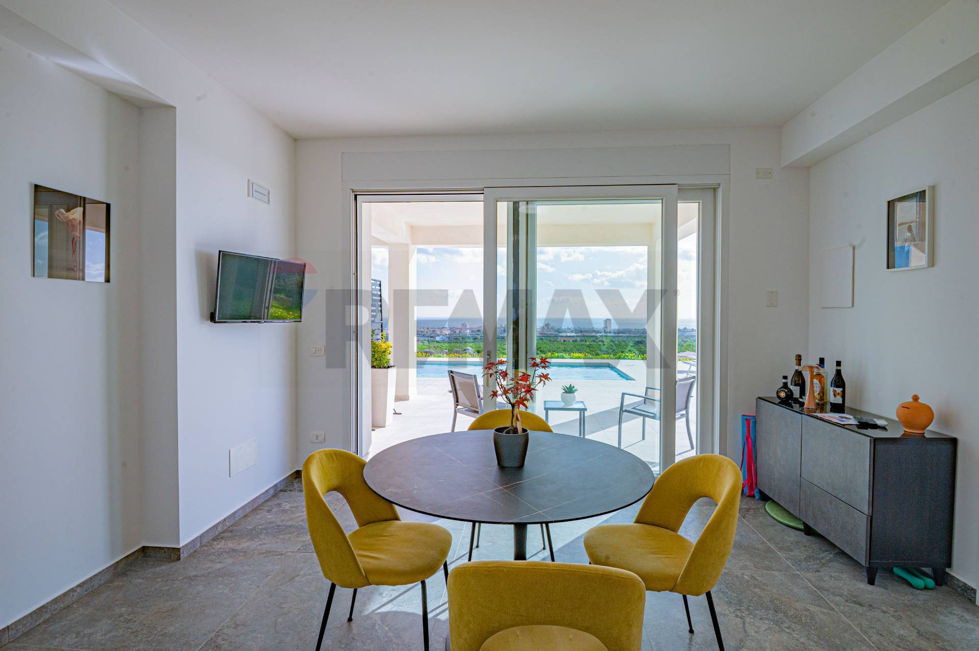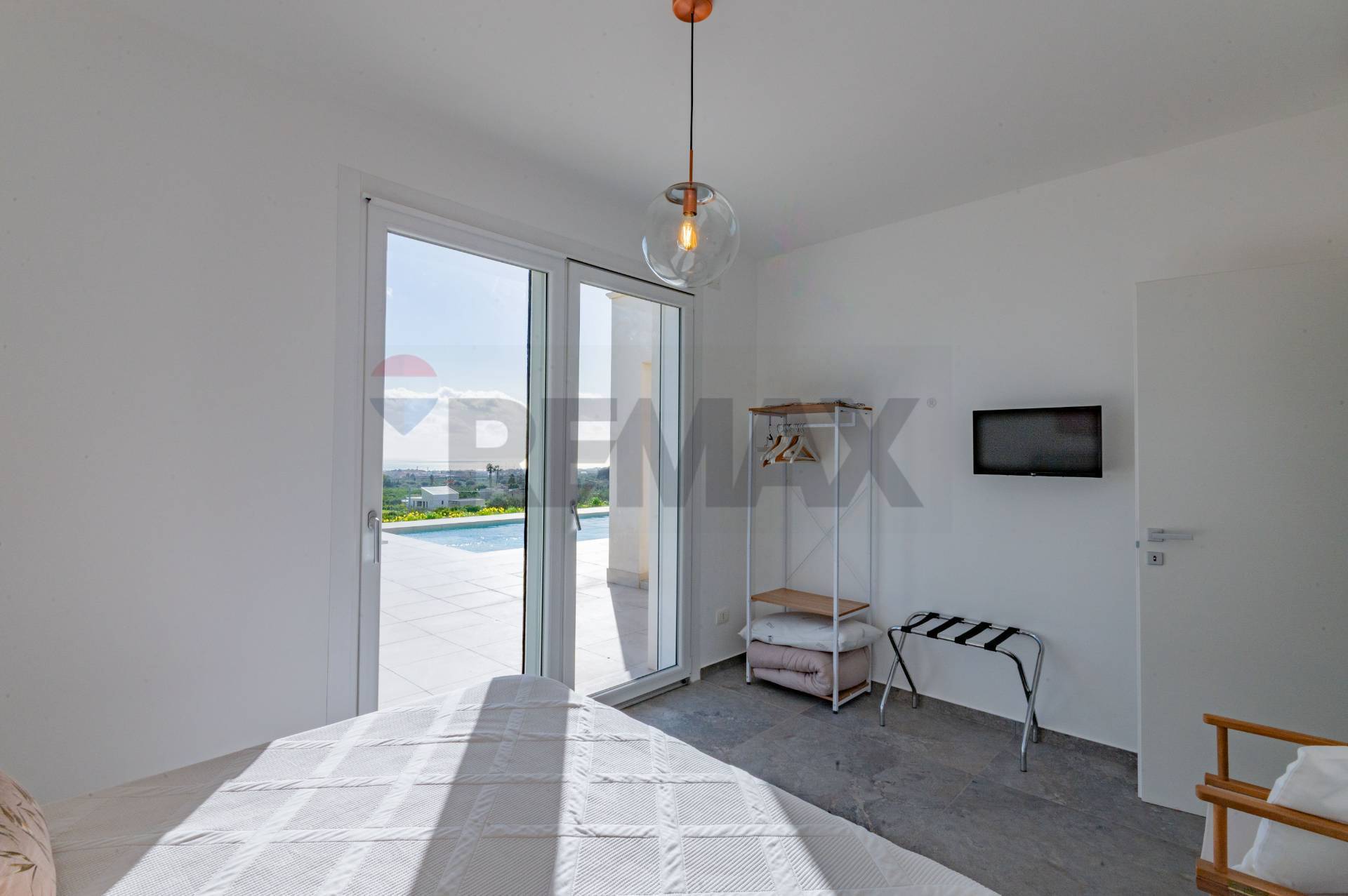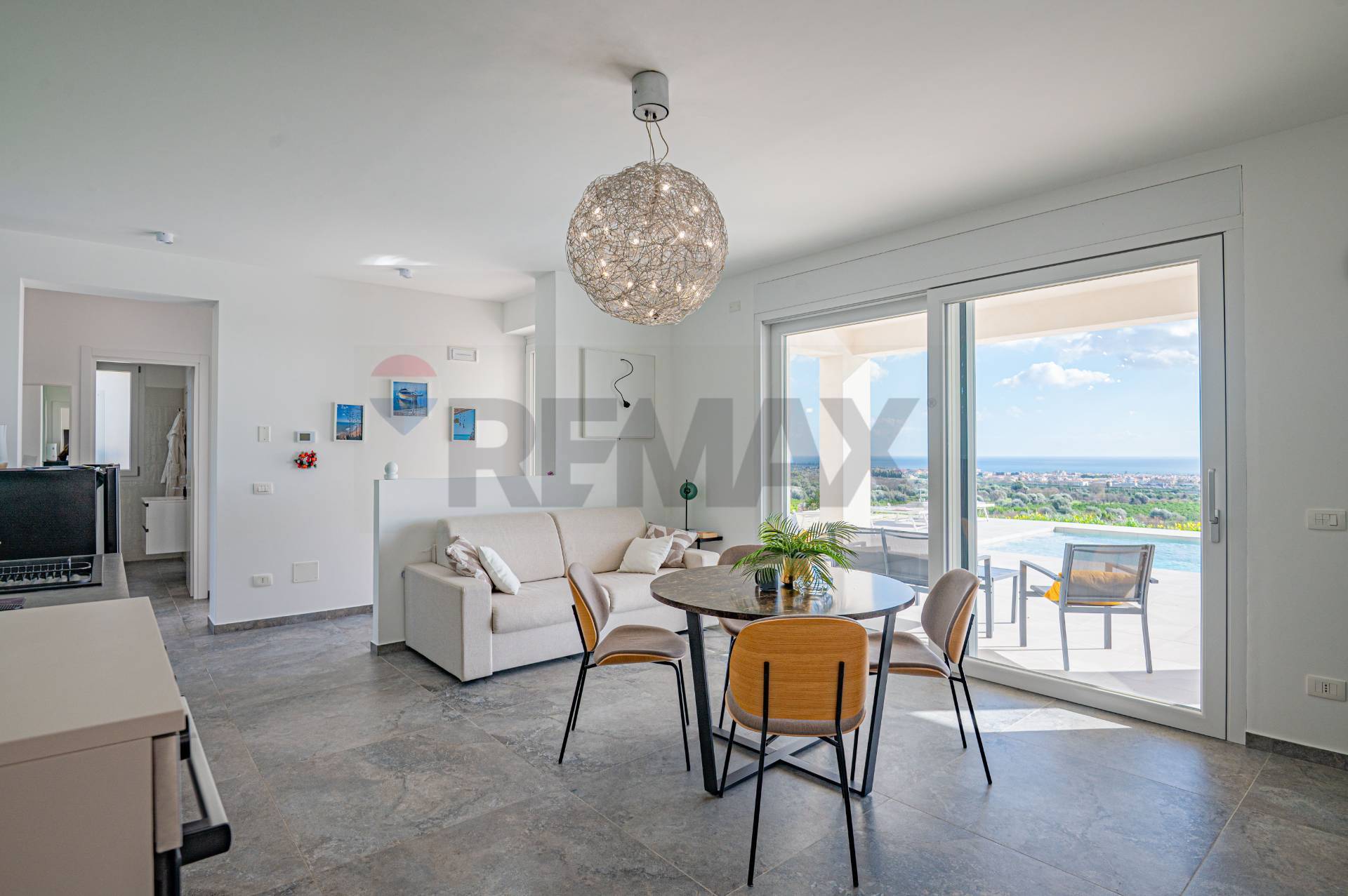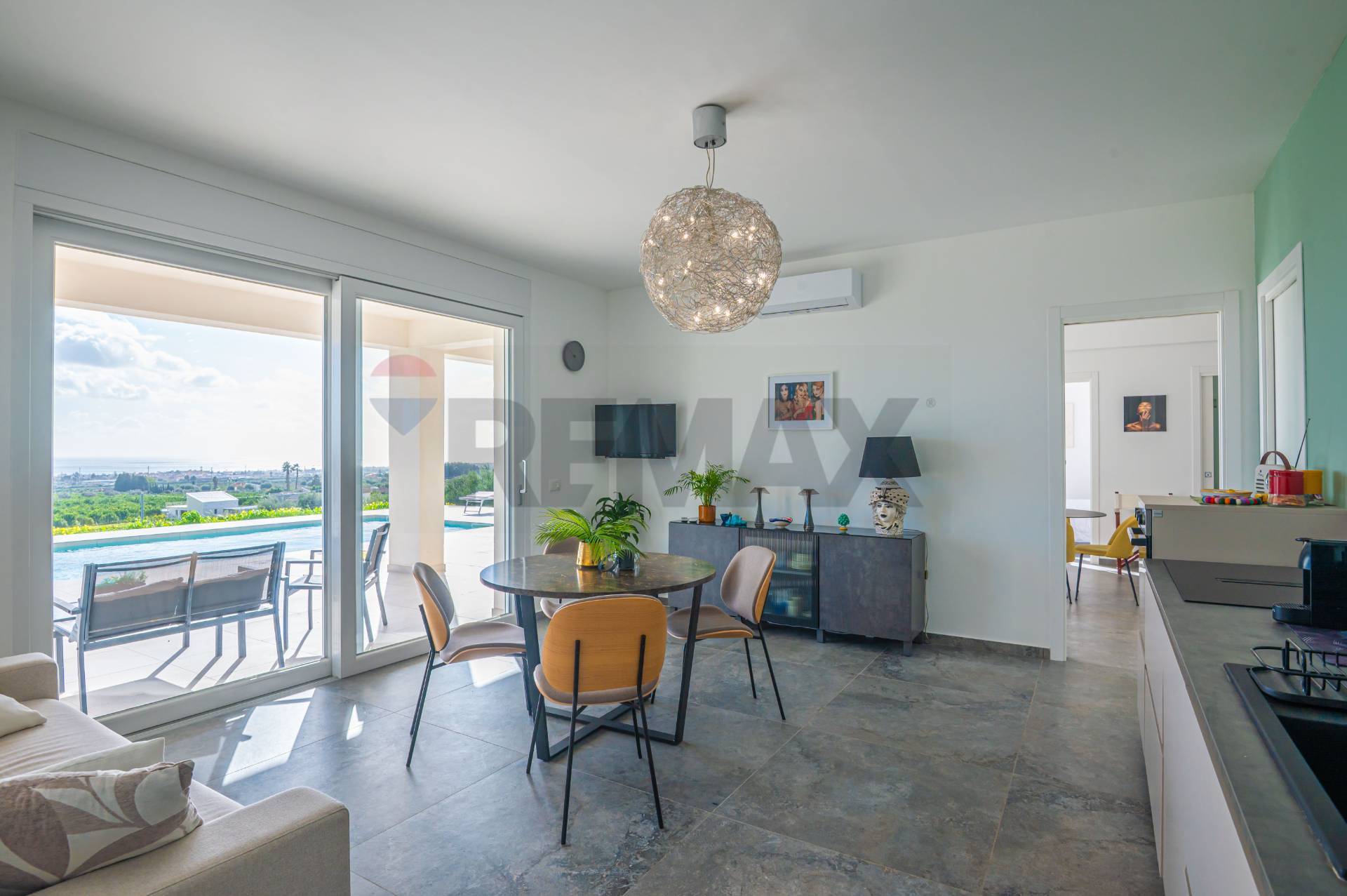 La villa ha una superficie di circa 163 mq ed è interamente sviluppata su un unico livello, garantendo comfort e funzionalità degli spazi. Gli ambienti interni sono ampi e luminosi e si articolano in due zone living, entrambe dotate di cucina moderna e con affaccio diretto sulla piscina, creando una perfetta continuità tra spazi interni ed esterni.