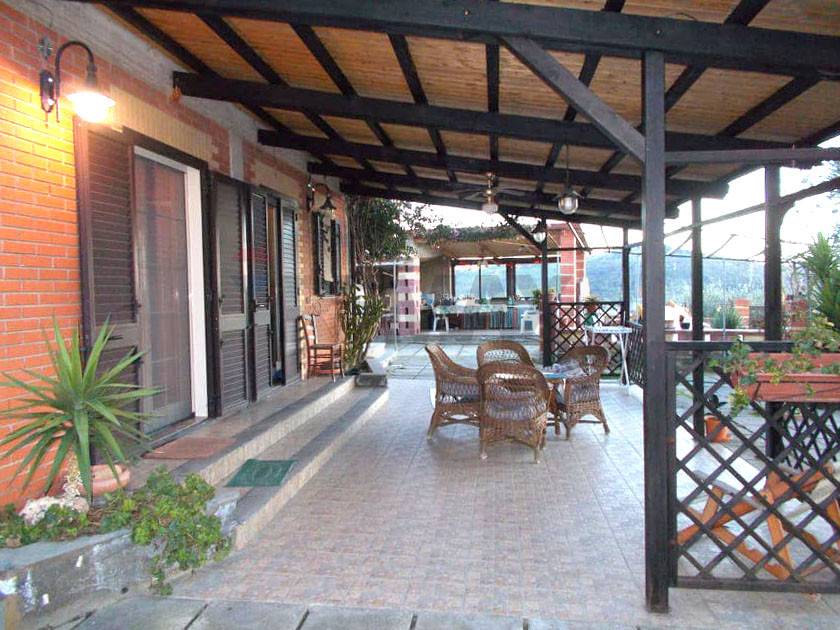 Piano terra rialzato, tutto intorno il perimetro dell’abitazione è terrazzato, dispone di ampio veranda da cui si ha accesso in cucina, con gazebo con angolo barbecue e forno a legna.