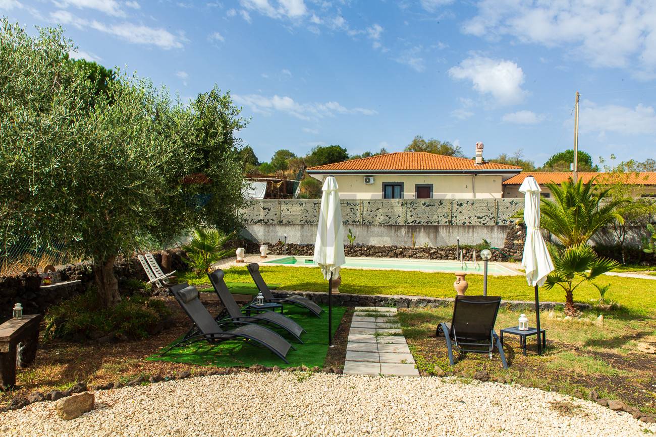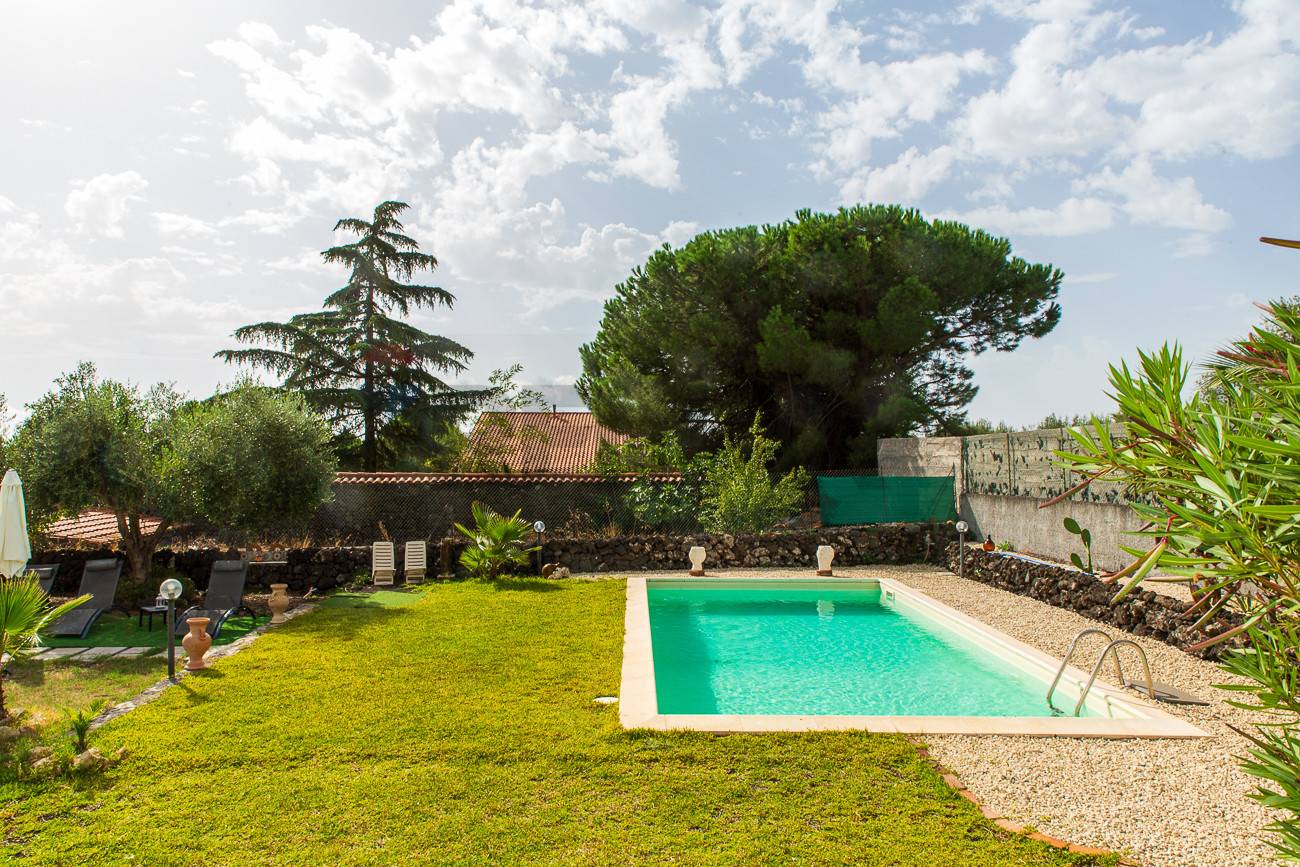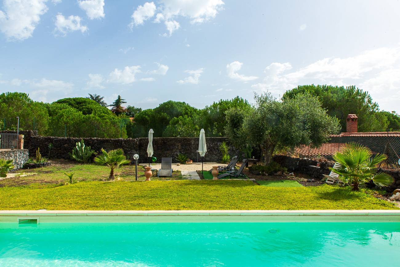 Appena il cancello si schiude, sei avvolto da un rigoglioso giardino mediterraneo, un vero trionfo di vita dove piante importanti gettano ombre benevole e l’aria è intrisa del profumo inconfondibile di zagara e gelsomino, che ti ricordano la vicinanza della campagna etnea. L’occhio è subito rapito dallo specchio d’acqua scintillante della piscina, un’oasi azzurra che invita a rinfrescarsi sotto il sole generoso della Sicilia, con la mente già proiettata a lunghe giornate di relax e serate estive.