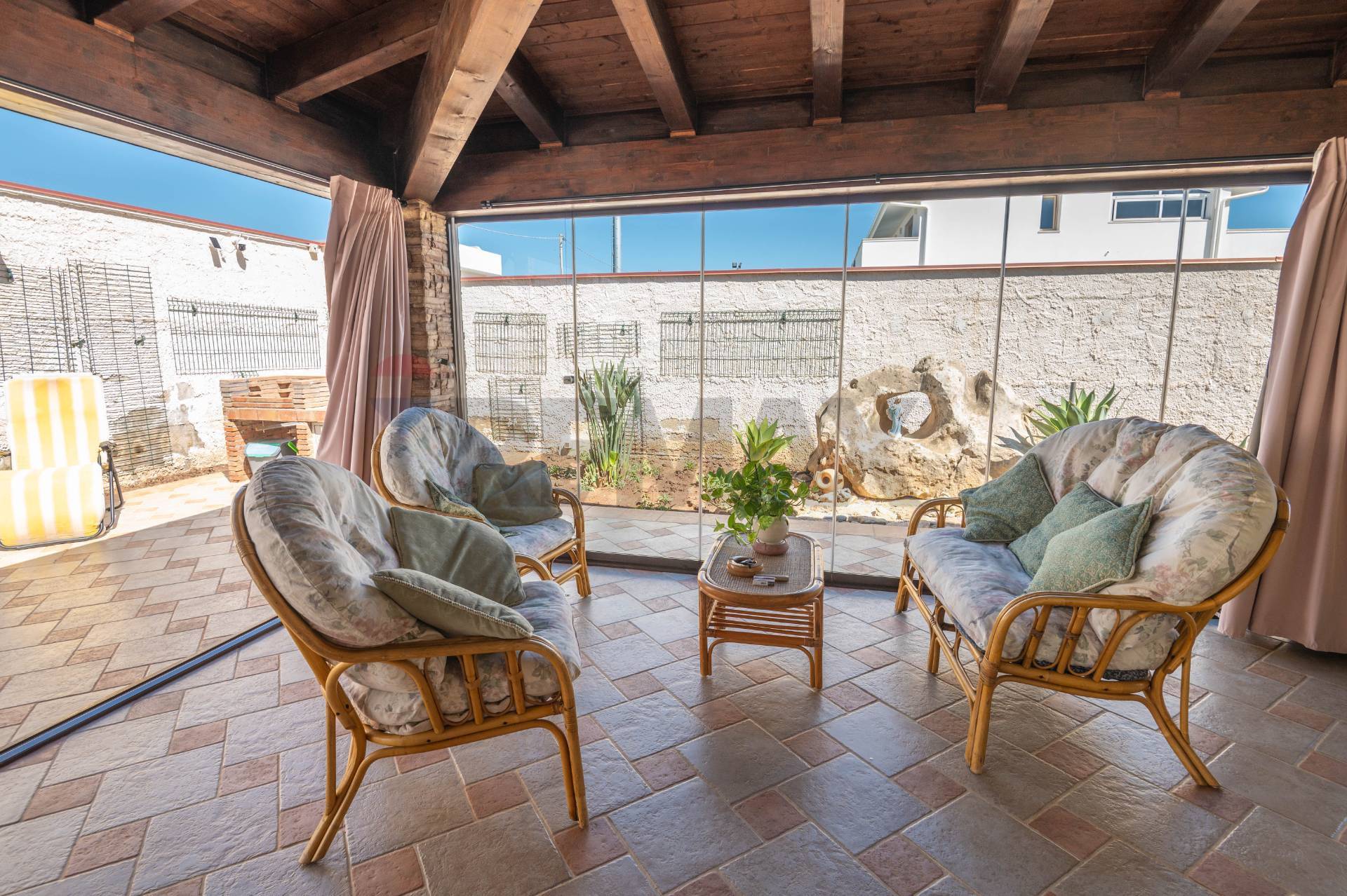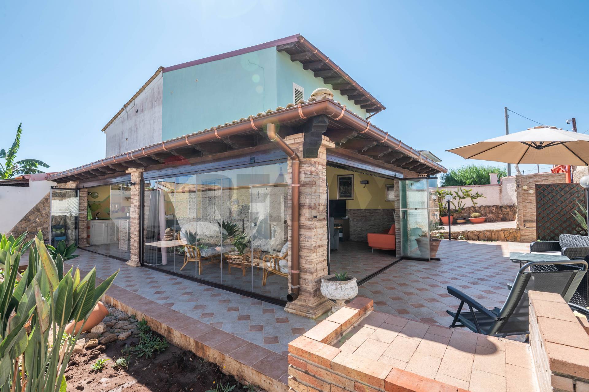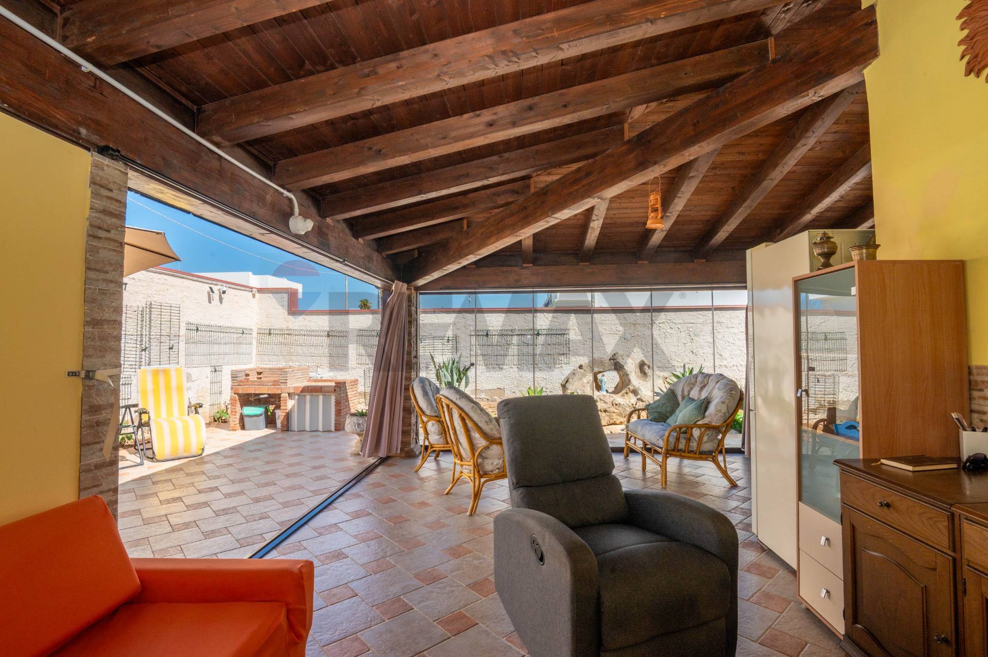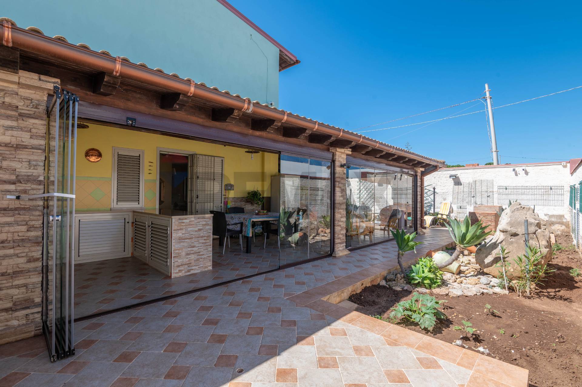 The ground floor immediately welcomes you to a glass-enclosed veranda, covered by an exposed wooden roof that adds warmth and character. This area features a built-in kitchen, ideal for entertaining, even in spring and autumn. Inside, the villa opens onto an open space with an additional kitchen, living area, and bathroom. Upstairs, there are two bedrooms, a bathroom with a window, and a convenient storage room.