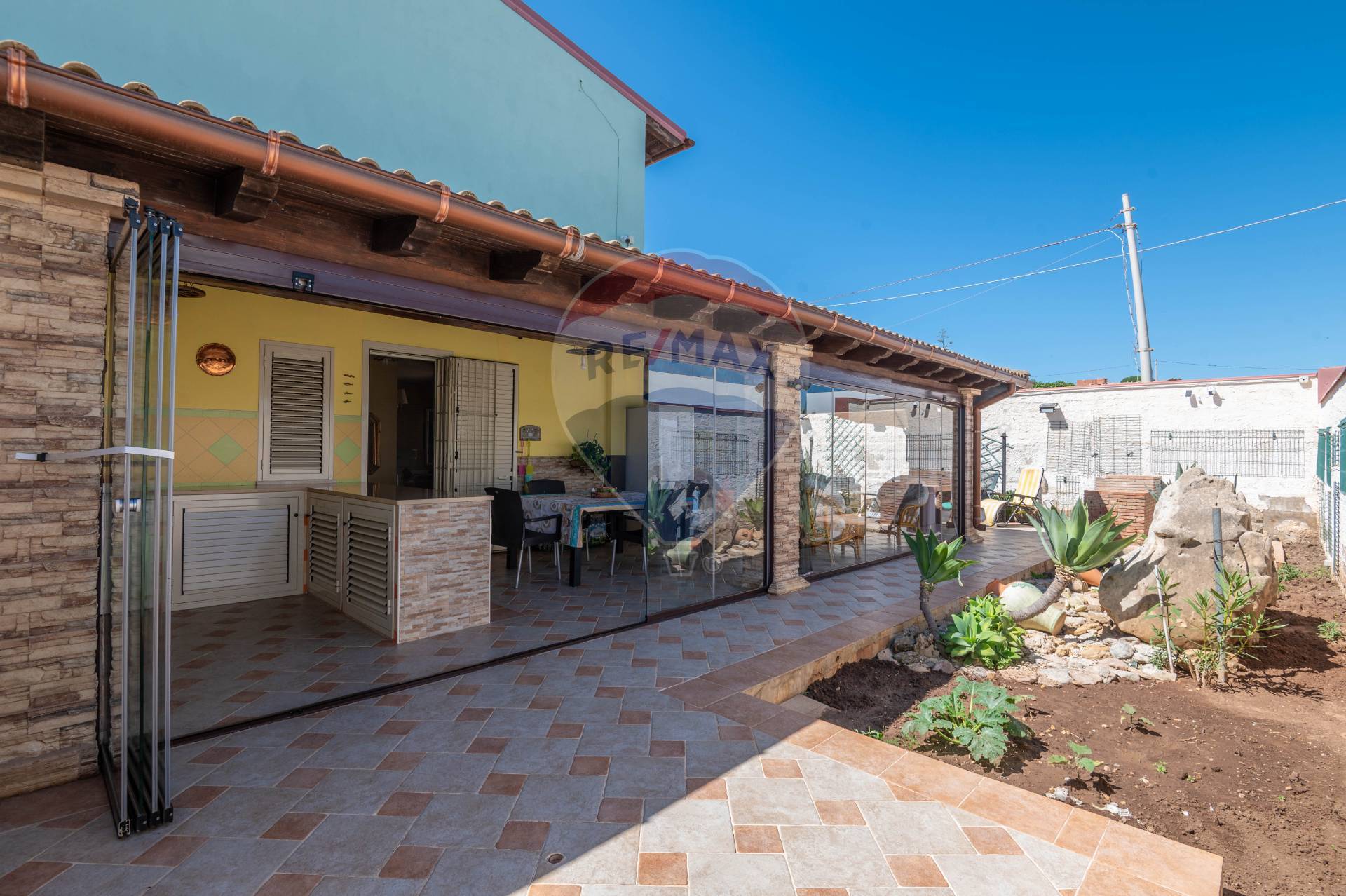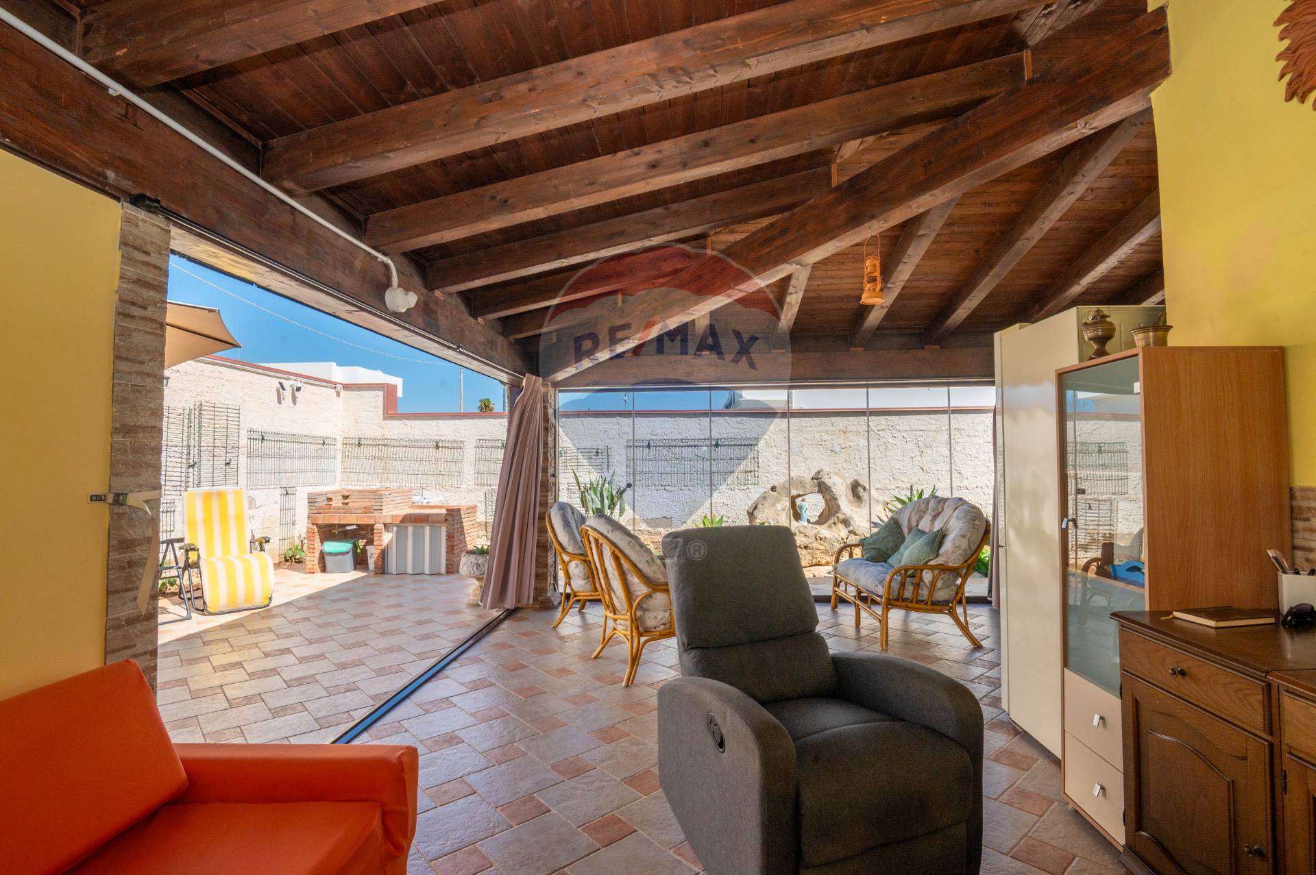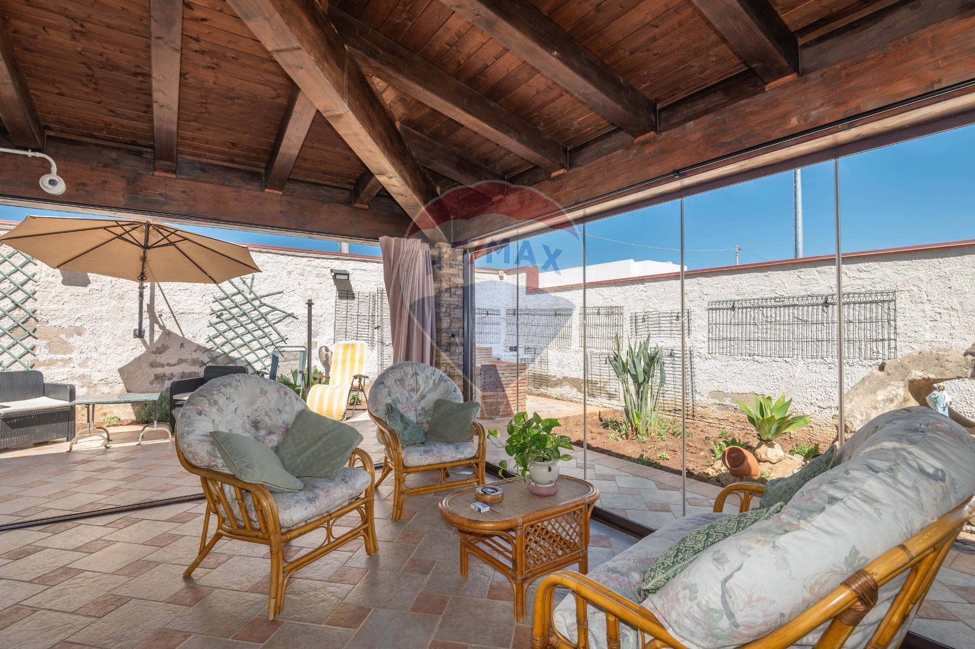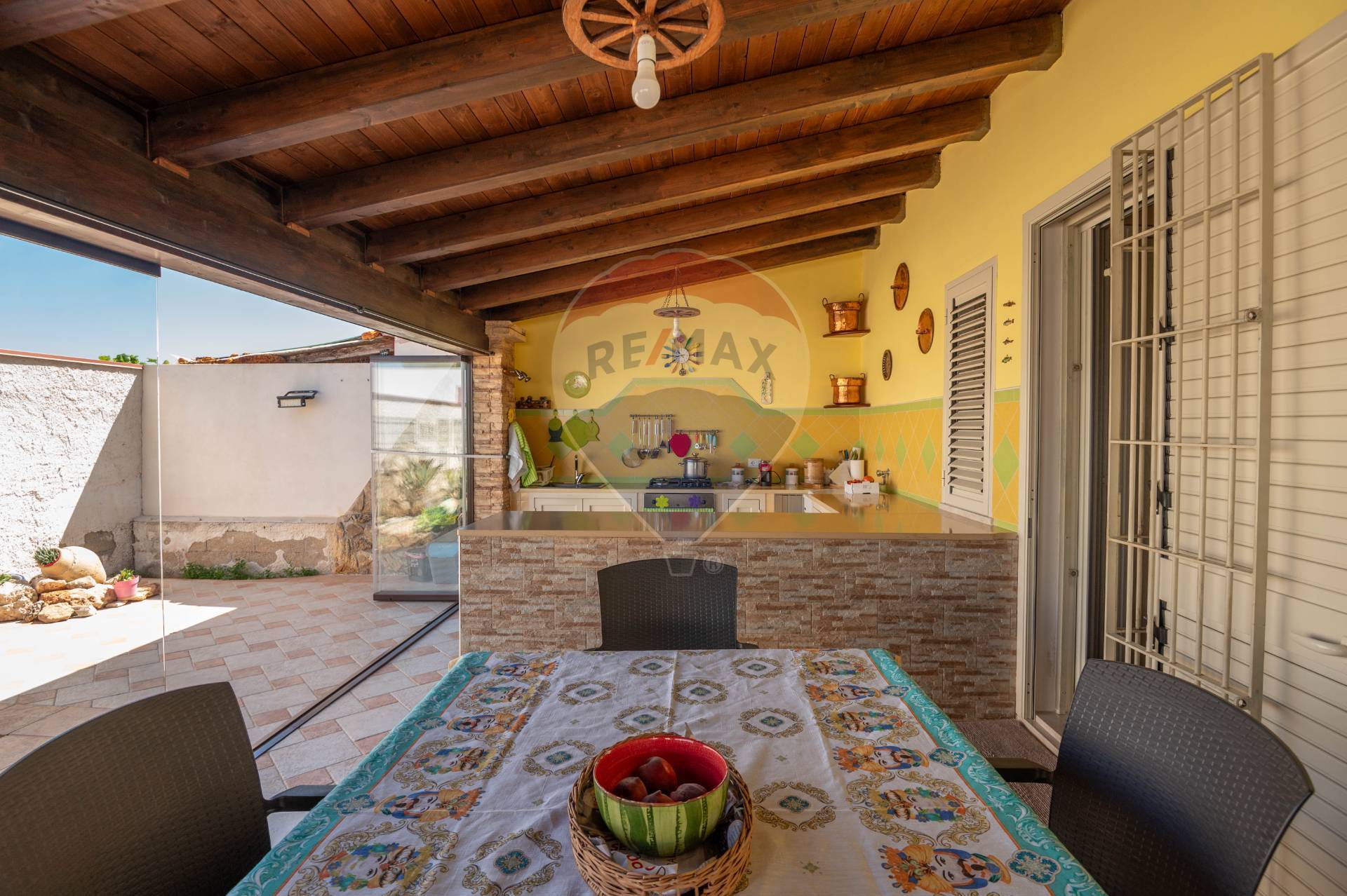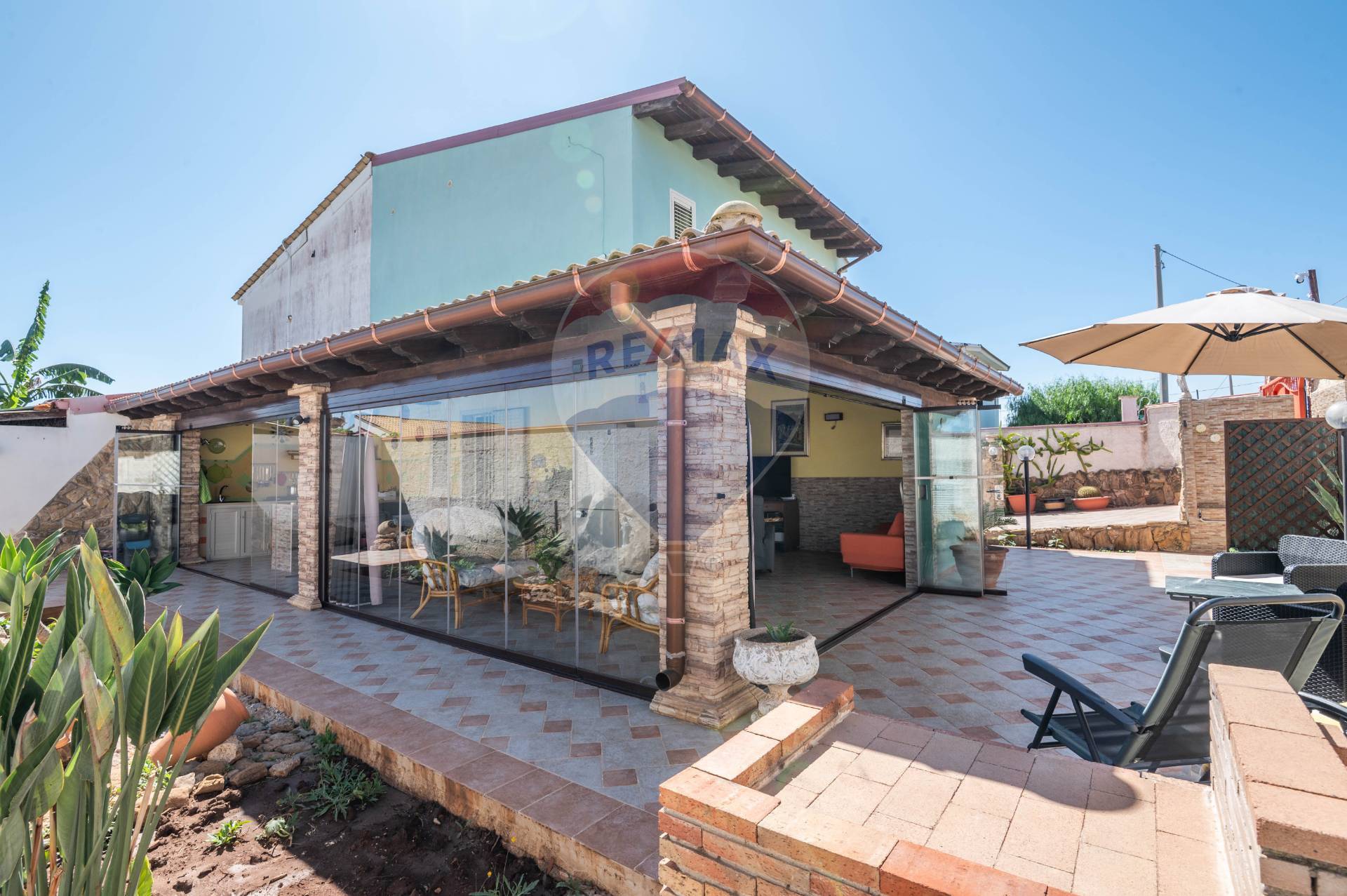 The ground floor immediately welcomes you to a glass-enclosed veranda, covered by an exposed wooden roof that adds warmth and character. This area features a built-in kitchen, ideal for entertaining, even in spring and autumn. Inside, the villa opens onto an open space with an additional kitchen, living area, and bathroom. Upstairs, there are two bedrooms, a bathroom with a window, and a convenient storage room.